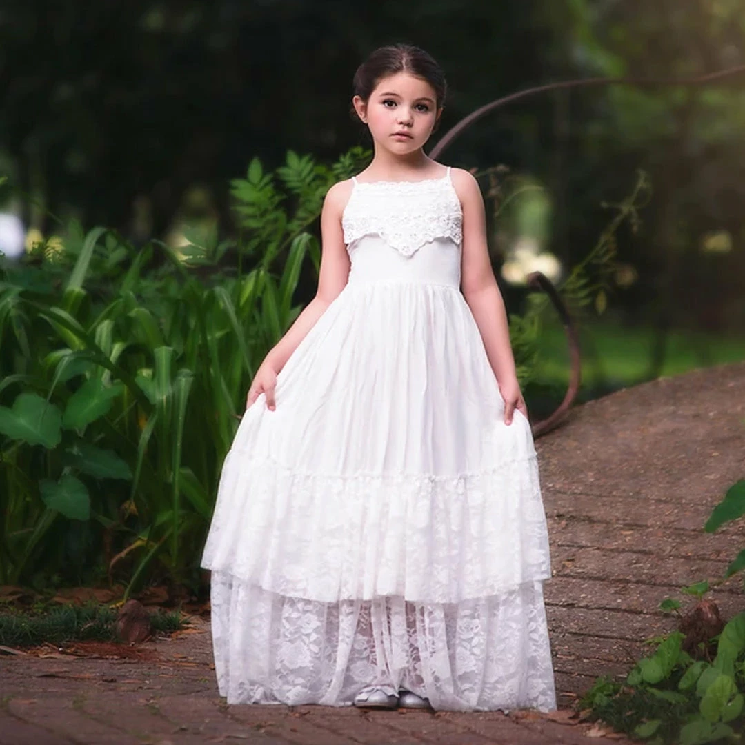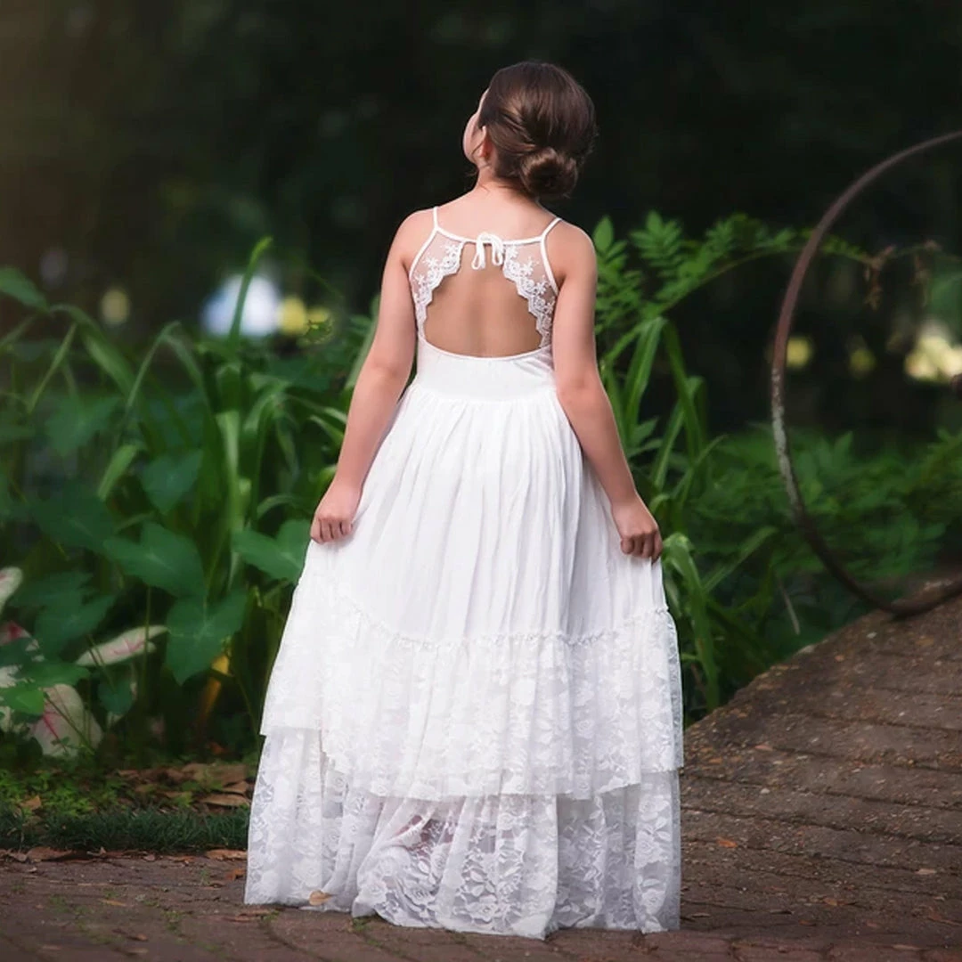 Simply stunning, this gown is just as pretty coming as it is going! This stretch cotton jersey dress will have your girl in a twirl. From the crochet bodice down to the lace ruffled hem, twirl her around to find a sweet tie back, for just the right fit. This soft, stretchy cotton is perfectly comfortable and machine washable. Â