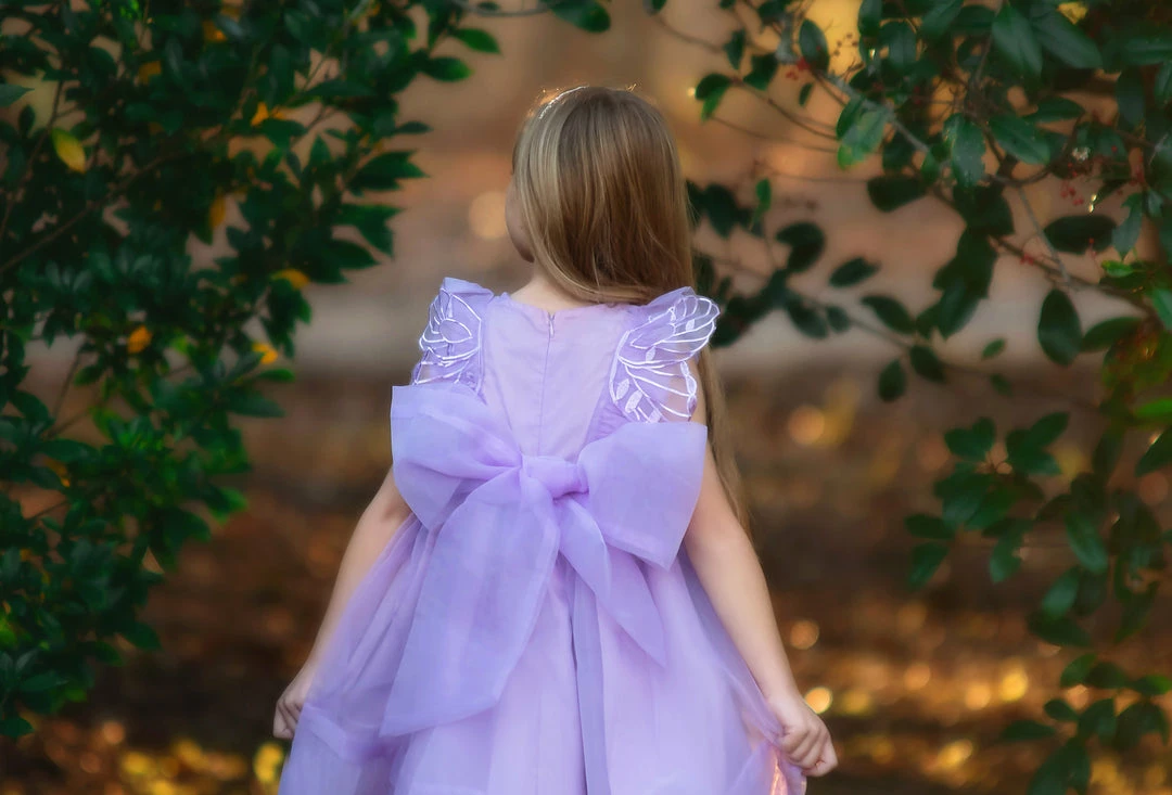 Sweetness has just flown in and she’s wearing our Alice dress with butterfly wings! The perfect combination of pleating and ruffles, this poly organza dress also comes with whimsically placed butterfly wings and a big self tie bow in back. She will be the talk of the town in this sweet frock. 100% poly self, 100% soft cotton lining. Machine wash, hang dry. Â