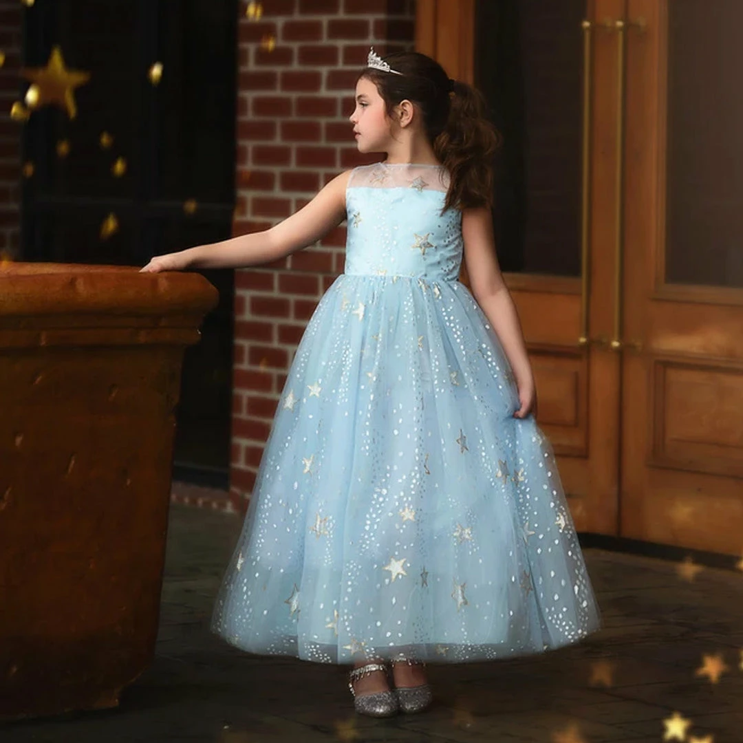 This gown will have all eyes on her! Stunning layers of light blue tulling graced with a sweet, delicate sparkle star print, your girl will be spinning with excitement! Fully lined with soft cotton and lots of built in poof, this gown is both stunning and comfortable. Self ties and fully washable!Â