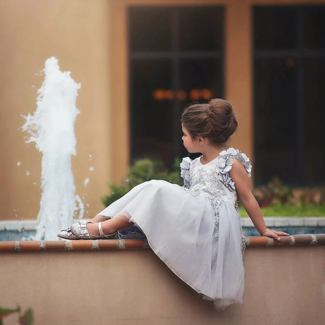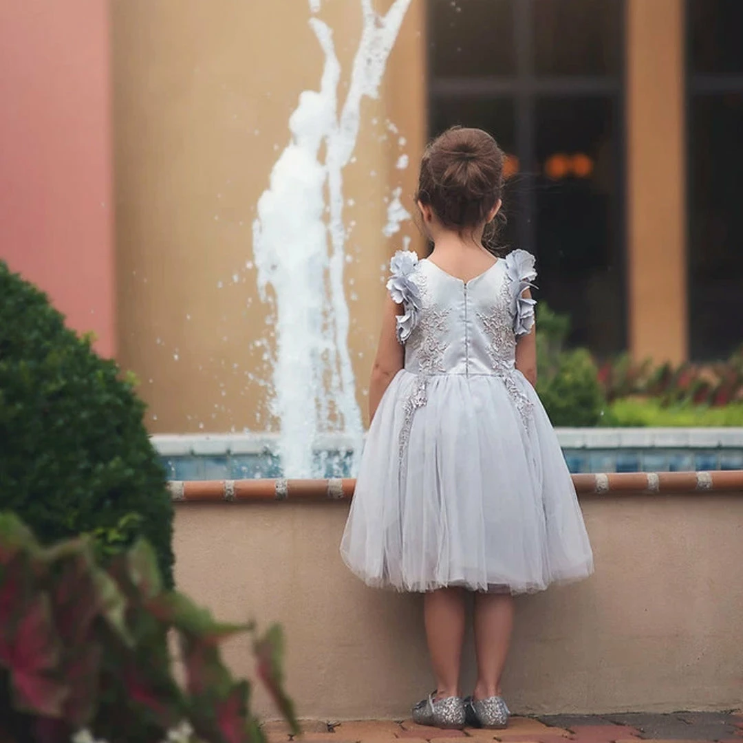 Fit for a princess, this dress has it all. Â Soft silver satin graced with a touch of lace, this dress is a showstopper! Â Sleeves are embellished with whimsical die cut flowers that will have all eyes on her. Â Tulling overlay skirt adds just the right touch of fullness and twirl. Â Fully lined with soft cotton, back zip. Â 100% poly self, 100% cotton lining. Machine wash, hang dry.