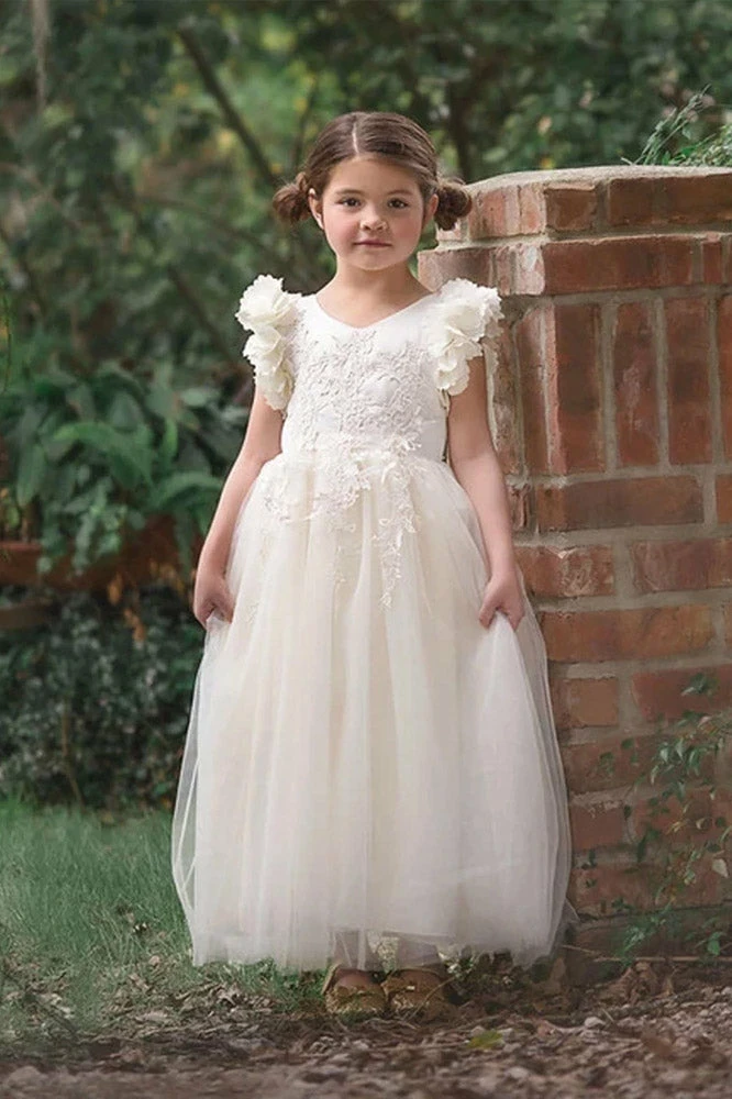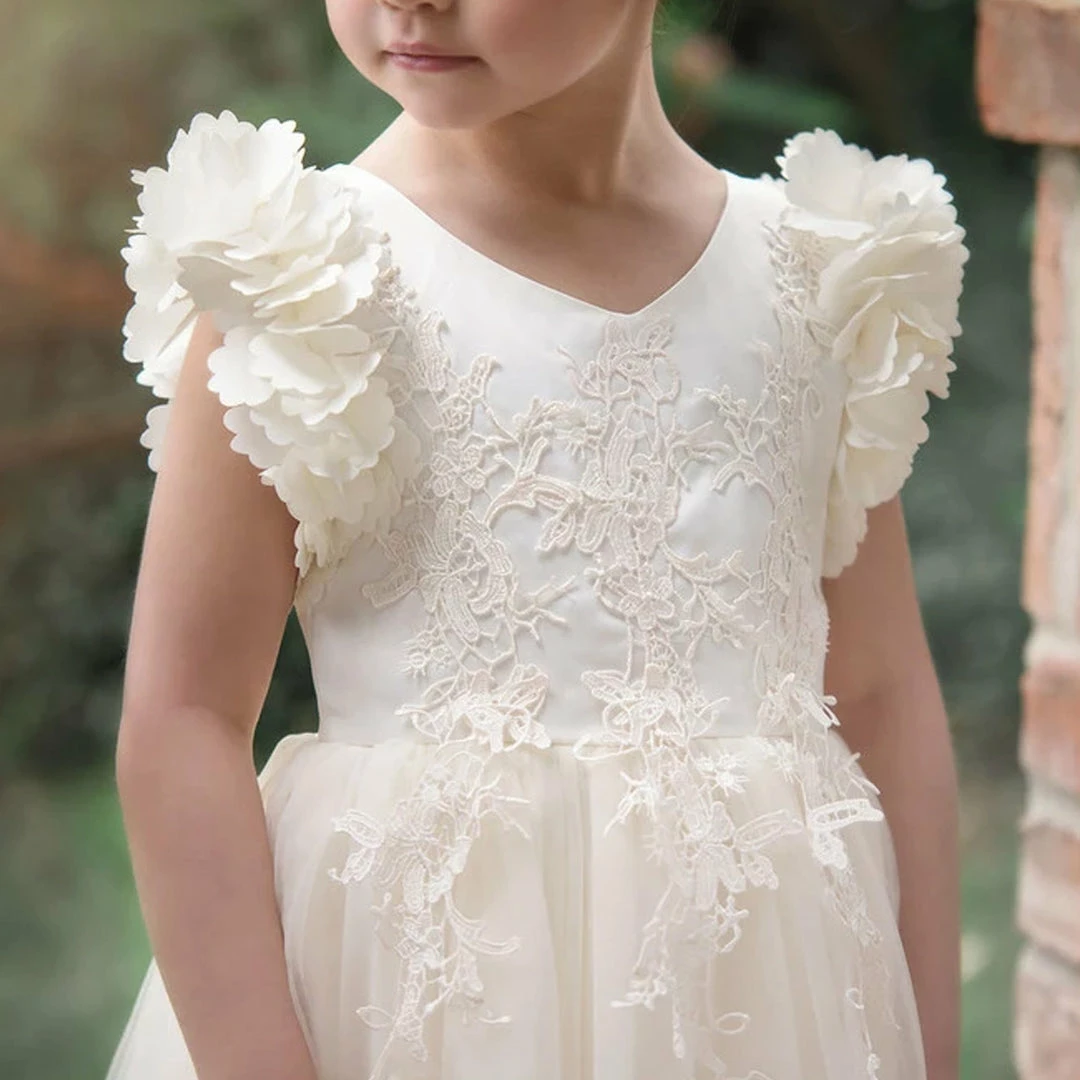 Fit for a princess, this dress has it all. Regal ivory satin graced with a touch of lace, this dress is a showstopper!  Sleeves are embellished with whimsical die cut flowers that will have all eyes on her.  Tulling overlay skirt adds just the right touch of fullness and twirl. This is a gorgeous full length gown.  Fully lined with soft cotton, back zip.  100% poly self, 100% cotton lining. Machine wash, hang dry.Â