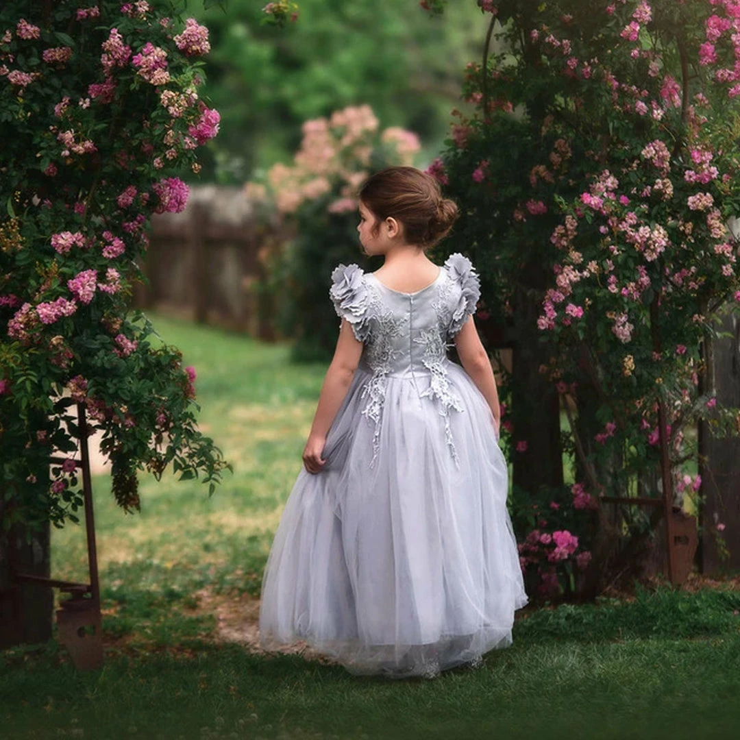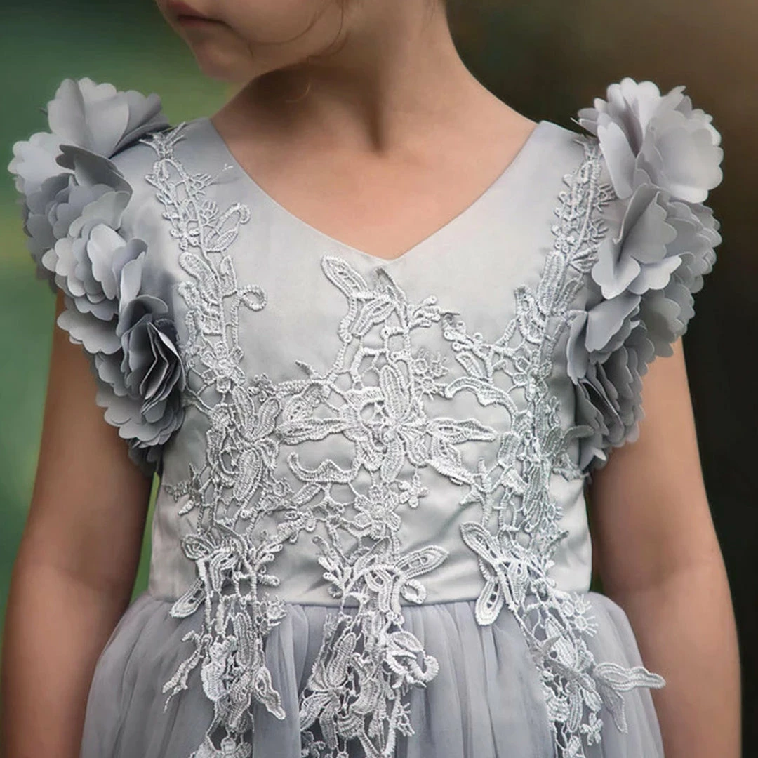 Fit for a princess, this dress has it all. Regal silver satin graced with a touch of lace, this dress is a showstopper!  Sleeves are embellished with whimsical die cut flowers that will have all eyes on her.  Tulling overlay skirt adds just the right touch of fullness and twirl. This is a gorgeous full length gown.  Fully lined with soft cotton, back zip.  100% poly self, 100% cotton lining. Machine wash, hang dry.Â
