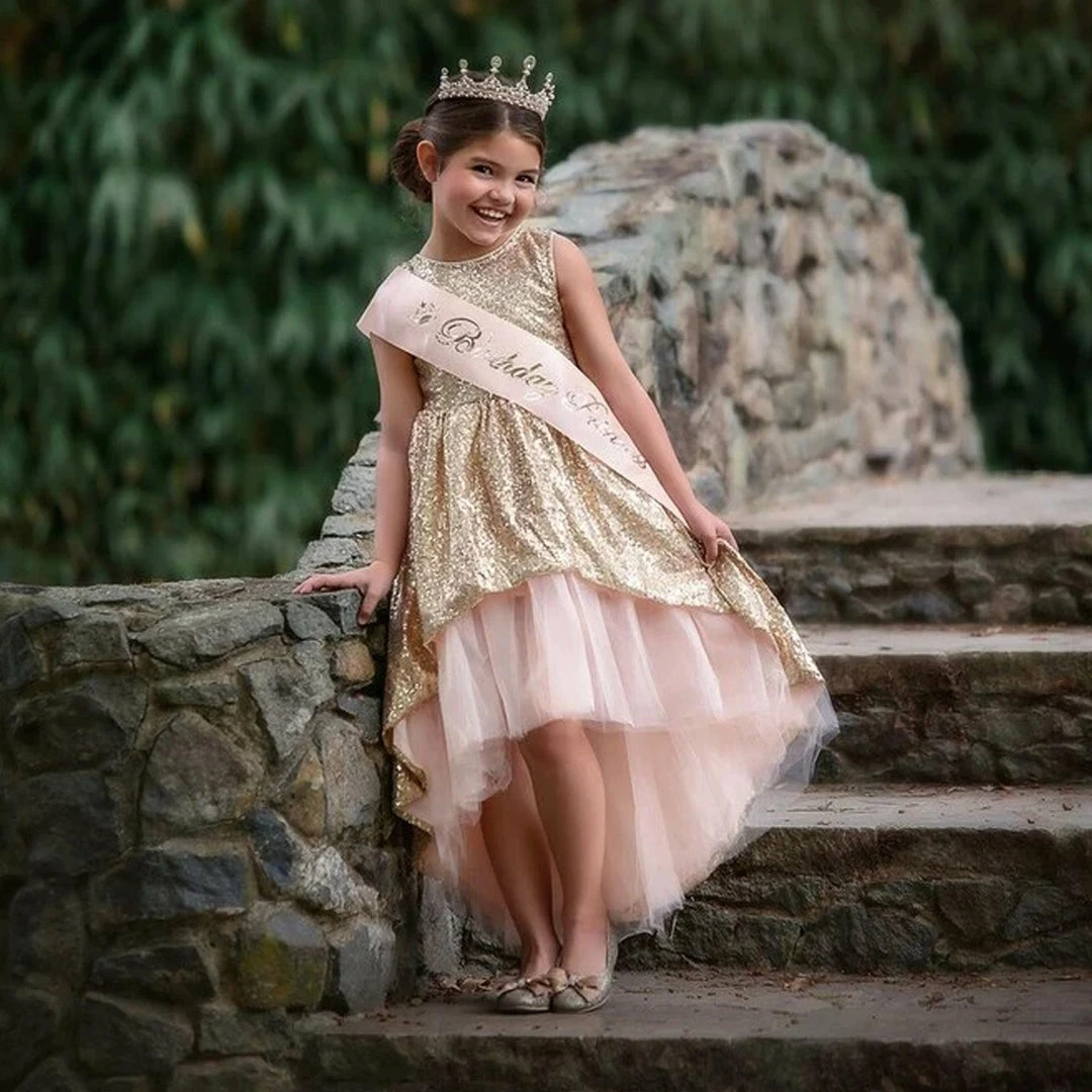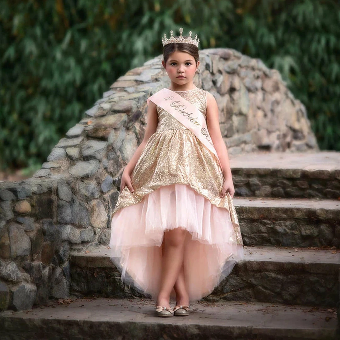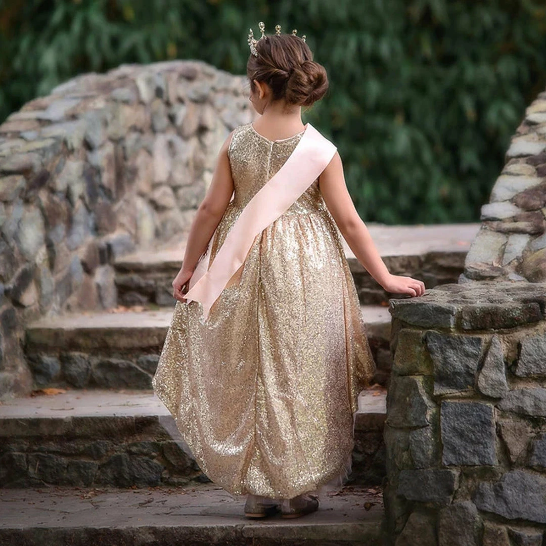 It’s HER day and she should shine! Made from the most popular birthday party colors, this birthday princess dress will have all eyes on her. The blush pink sequin bodice is pure perfection, perfectly trimmed with piping at the neckline and arms. The oh so twirly skirt will have your girl in a spin! This birthday girl dress is fully lined with soft cotton and made with our signature soft fabrications for the tactile sensitive child. The sash is completely removable and the dress can be worn over and over to her most special of occasions. Â