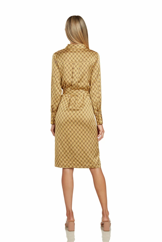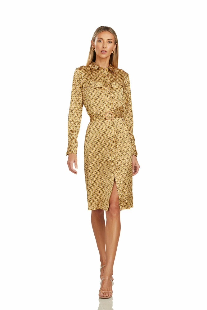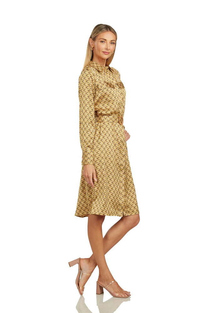 This button front golden frock has bodice flap pockets and finished off with a bamboo buckled belt.Â