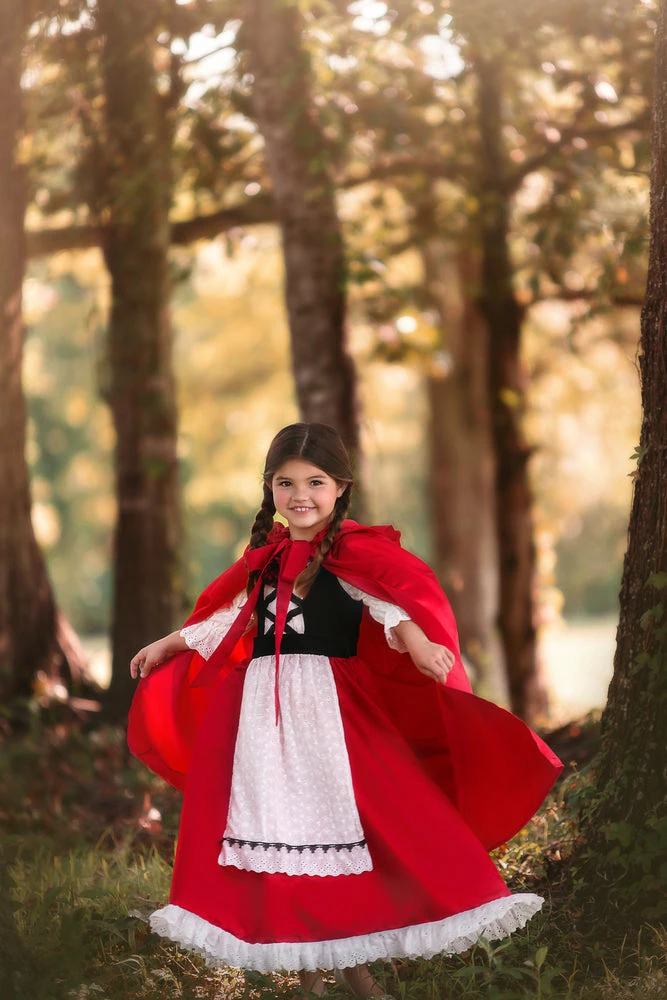 Part of our luxe collection, this red riding hood dress and cape set will not disappoint! Full of details and charm, the dress comes with a red satin skirt, topped with an eyelet apron and luxe trimmings. The velvet bodice has white eyelet sleeves, velvet trimmings and is finished with a perfectly place rose. The long red satin cape has a ruffled hood and finished off with a self tie satin ribbon. This costume will have her imagination soaring! Truly a photographers dream and a keepsake for years to come. 100% poly self, 100% soft cotton contrast. Back zip. Machine wash, hang dry.