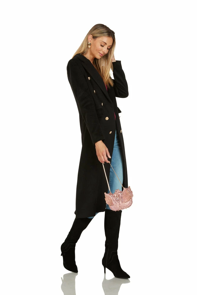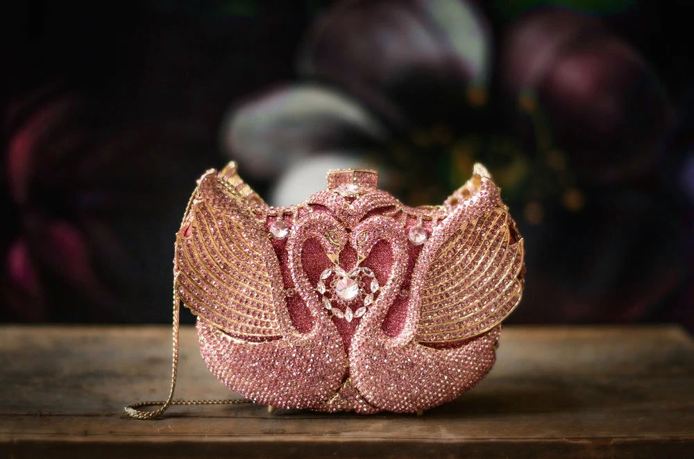 An alloy metal outer is adorned with stunning pink jewels and finished with a removable dainty chain and a clasp-top closure.Â