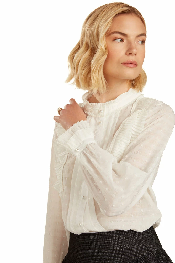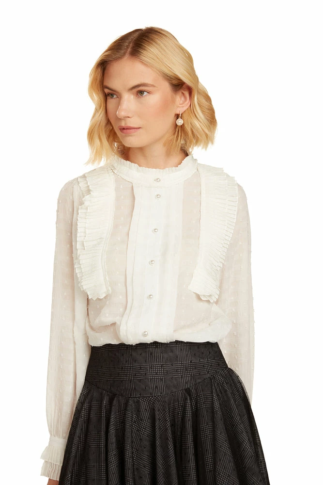This elegant ruffled blouse is made of a gorgeous patterned white chiffon,