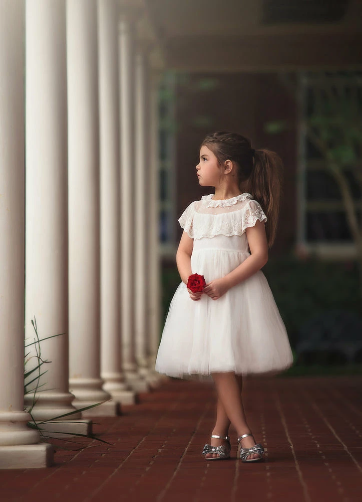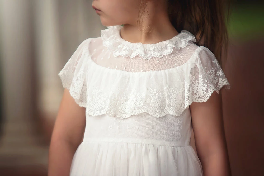 Soft and perfectly elegant for her most special of occasions, the Giovanna dress will have all heads turning. Â Layers upon layers of tulling grace the skirt of this oh so twirly dress, while a soft flounce of soft lace graces the neckline. Â This dress is soft and perfectly lined with pure cotton. Â Back zip. Â Machine wash, hang dry. Â 100% poly self, 100% cotton lining.Â