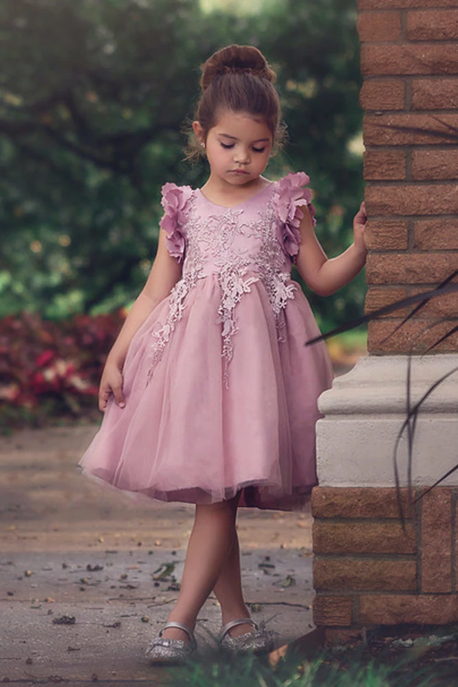 Fit for a princess, this dress has it all. Â Soft rose colored satin graced with a touch of lace, this dress is a showstopper! Â Sleeves are embellished with whimsical die cut flowers that will have all eyes on her. Â Tulling overlay skirt adds just the right touch of fullness and twirl. Â Fully lined with soft cotton, back zip. Â 100% poly self, 100% cotton lining. Machine wash, hang dry.Â