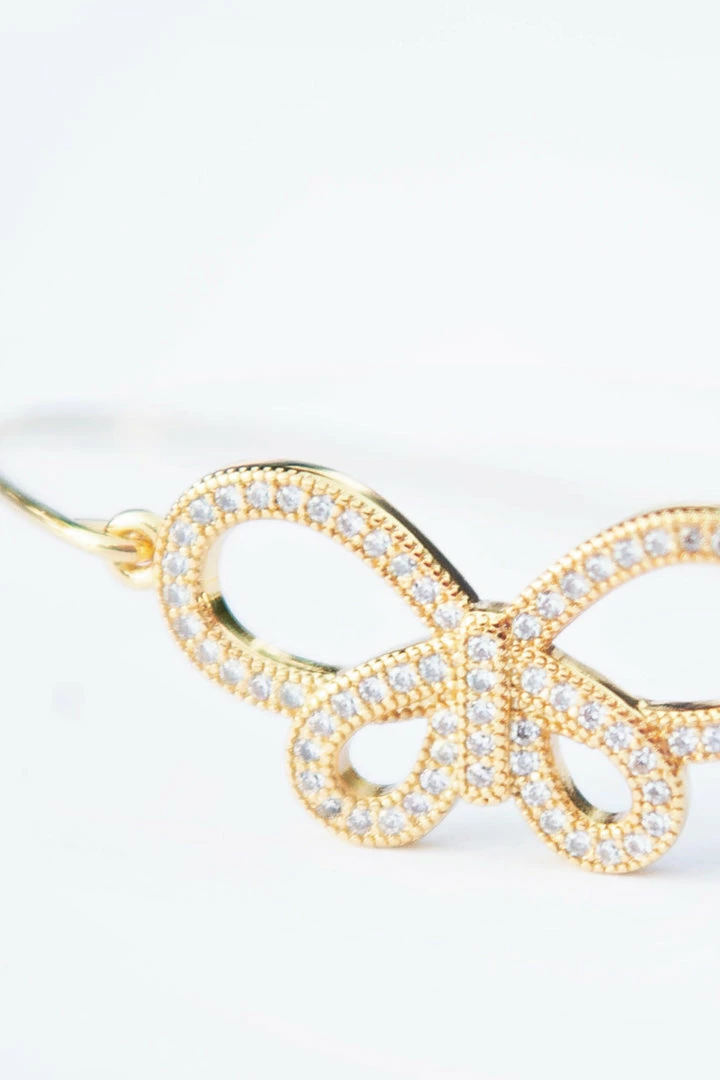 The perfect sparkly addition to her outfit! This rhinestone-studded bow bracelet is finished with a hook-and-eye-closure. 18k plated over brass.
