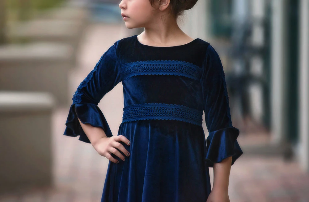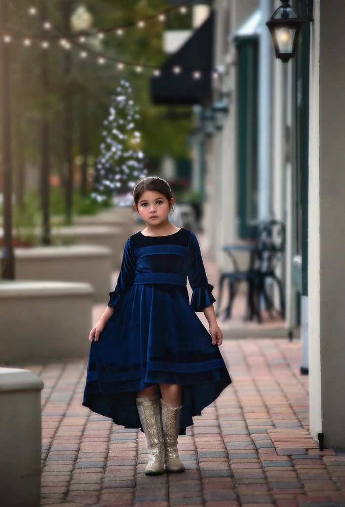 She will have all eyes on her wearing this posh velvet frock! Soft velvet graced with lace details and a hi-lo skirt, perfect for the girl and her twirl! Fully lined with soft cotton. Back zip. Machine wash, hang dry.