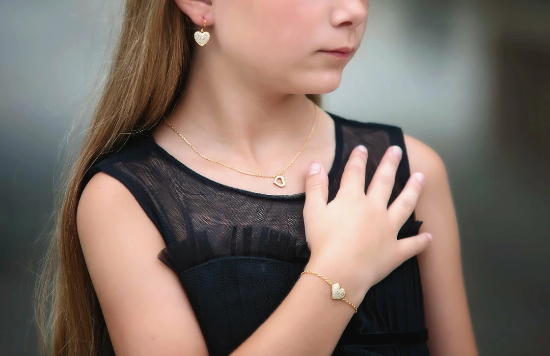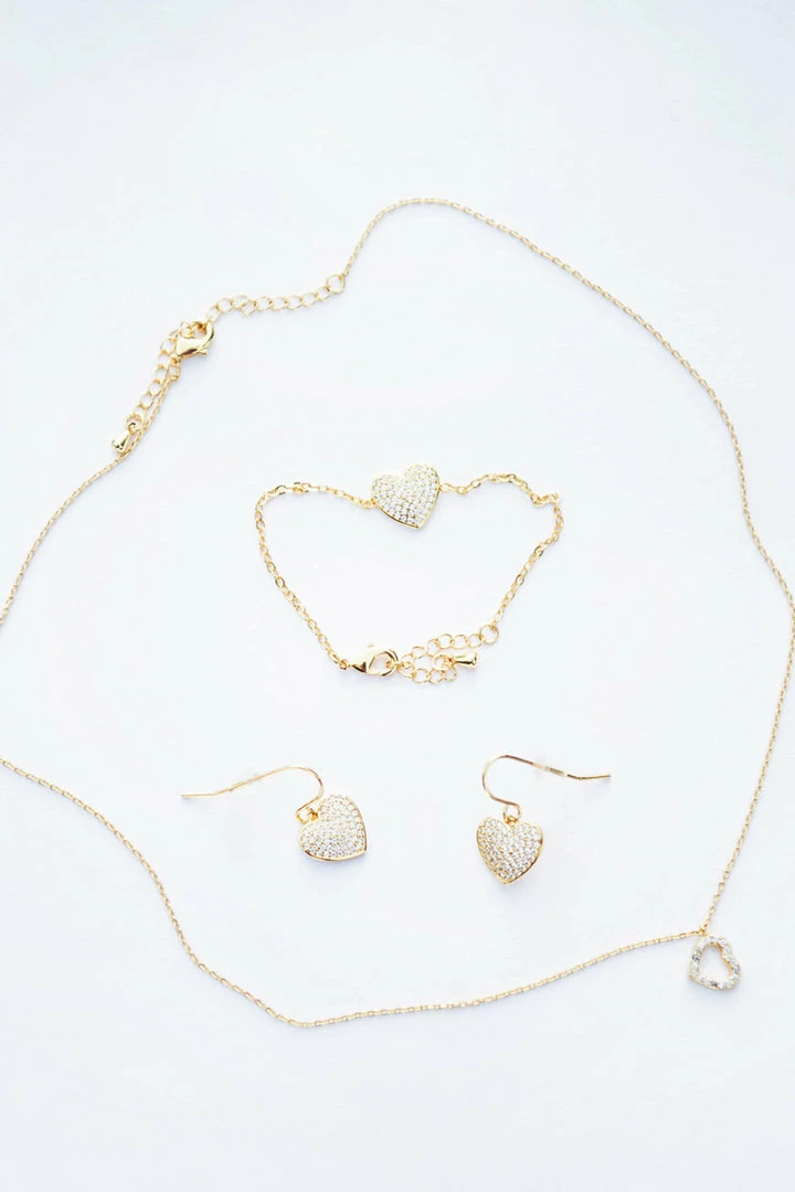 The perfect touch of sparkle to her outfit! Set includes heart pendant necklace, bracelet & earrings. Hypoallergenic. 18k plated over brass.