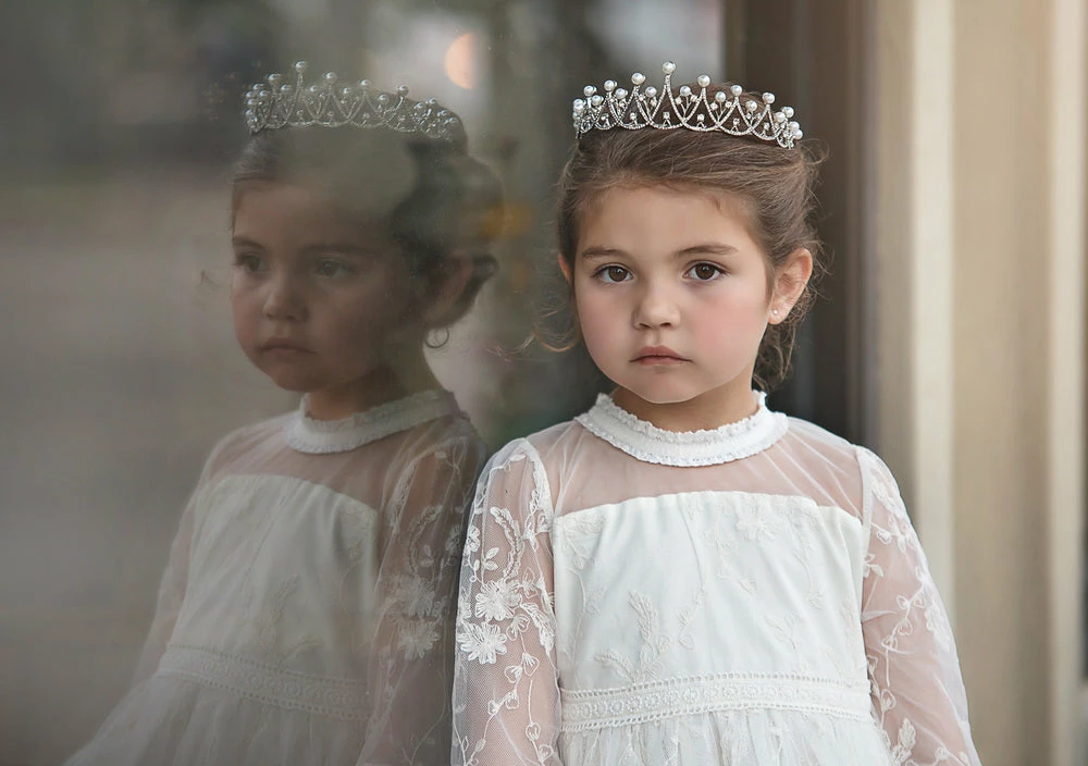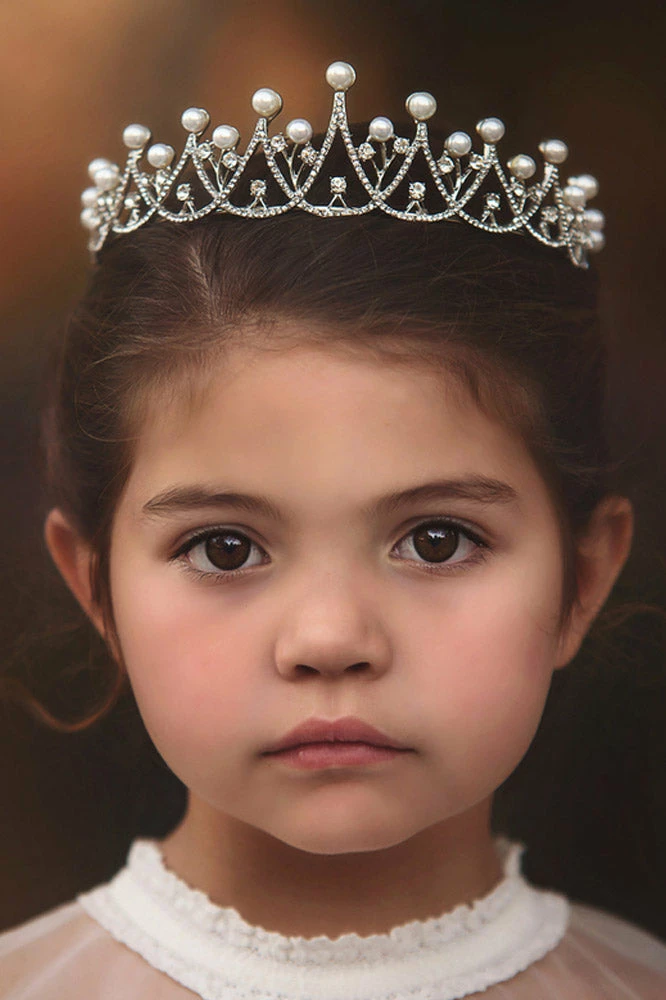 This tiara is a showstopper! A beautiful blend of pearls and rhinestones, in a metal setting, this tiara will not disappoint. While we show these on our child models, we have brides that love our tiaras, because they are THAT nice. Definitely a photographers dream to shoot.