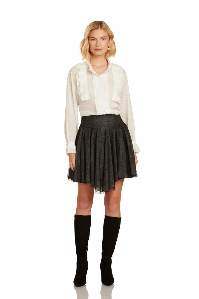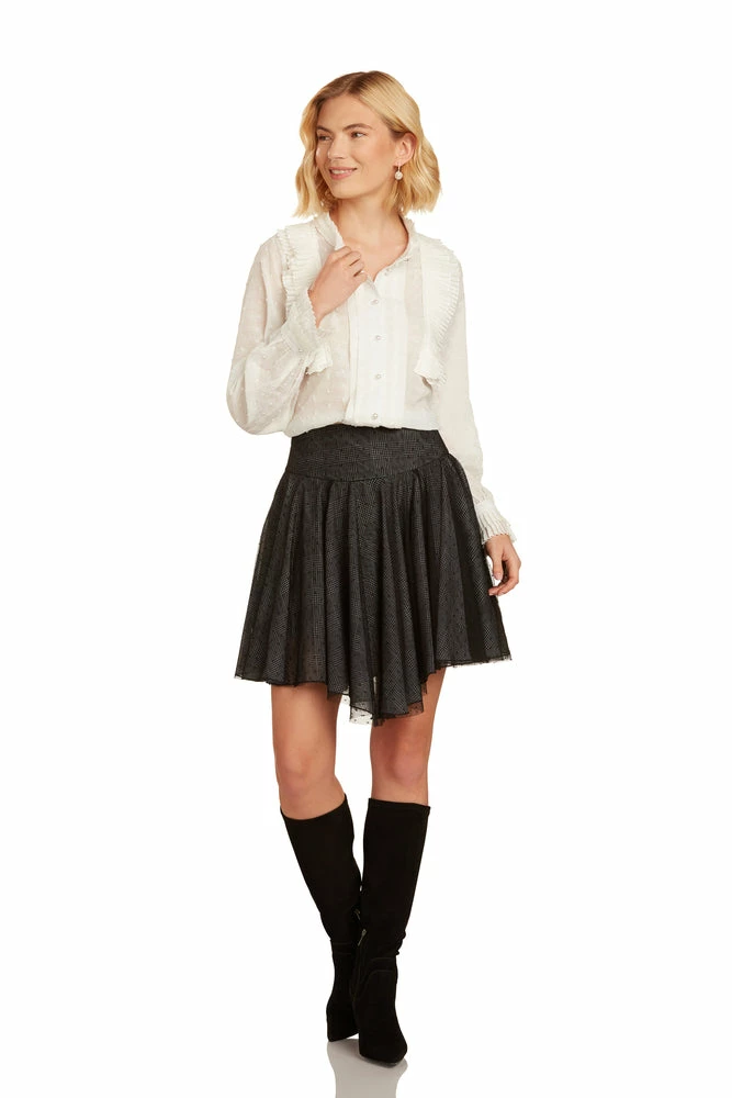 Whirly twirly and sassy is this skirt! A stunning glen plaid fabric is layered with a black dot mesh, for the perfect glam skirt.Â