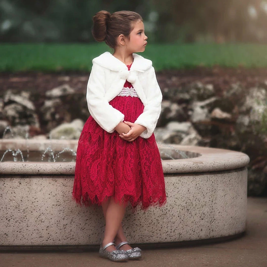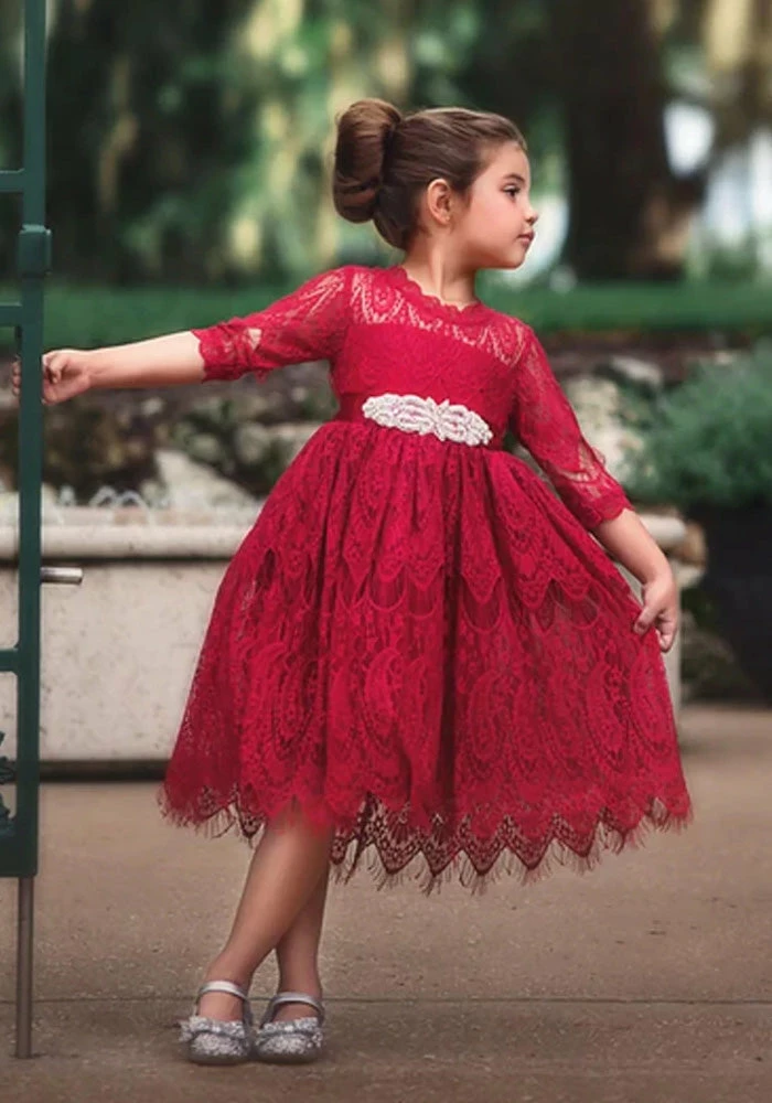 This vintage inspired lace frock is absolutely stunning in person.  The color is a dreamy deep crimson and photographs amazing.  The lace is soft, not scratchy and has a French eyelash edging, creating a touch of vintage whimsy.  The dress is fully lined with soft cotton and has a back zipper.  The sparkle belt is completely removable and self ties in back for just the right amount of glam. This color is gorgeous and will be a photographers dream to shoot.  Machine wash, hang dry.  WE RECOMMEND REMOVING THE BELT DURING ACTIVE PLAY. THE BELT CAN SNAG ON THE LACE AND CAUSE DAMAGE TO THE DRESS.Â