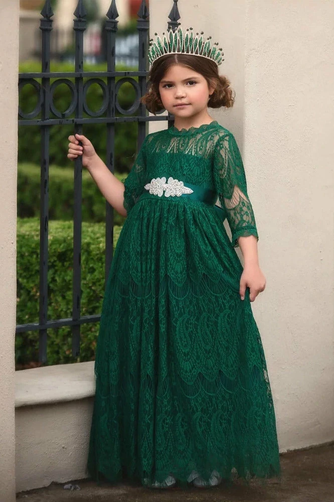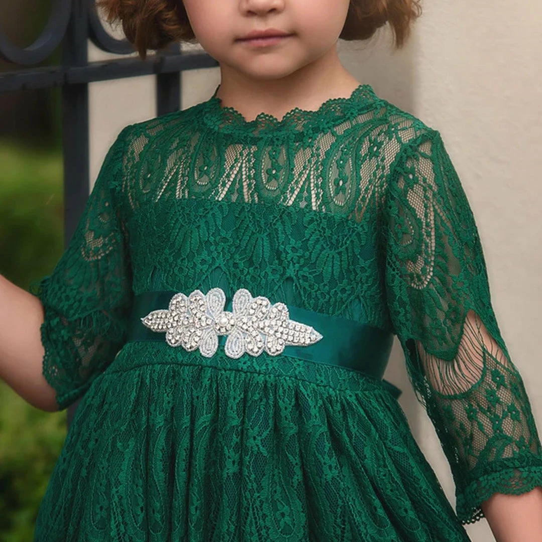 One of our most popular dresses has arrived in a stunning long gown. This vintage inspired lace frock is absolutely gorgeous in person.  The color is a dreamy emerald green and photographs amazing.  The lace is soft, not scratchy and has a French eyelash edging, creating a perfect touch of vintage whimsy.  The dress is fully lined with soft cotton and has a back zipper.  The sparkle belt is completely removable and self ties in back for just the right touch of sweetness. 100% poly self, 100% soft cotton lining. Machine wash, hang dry. Â