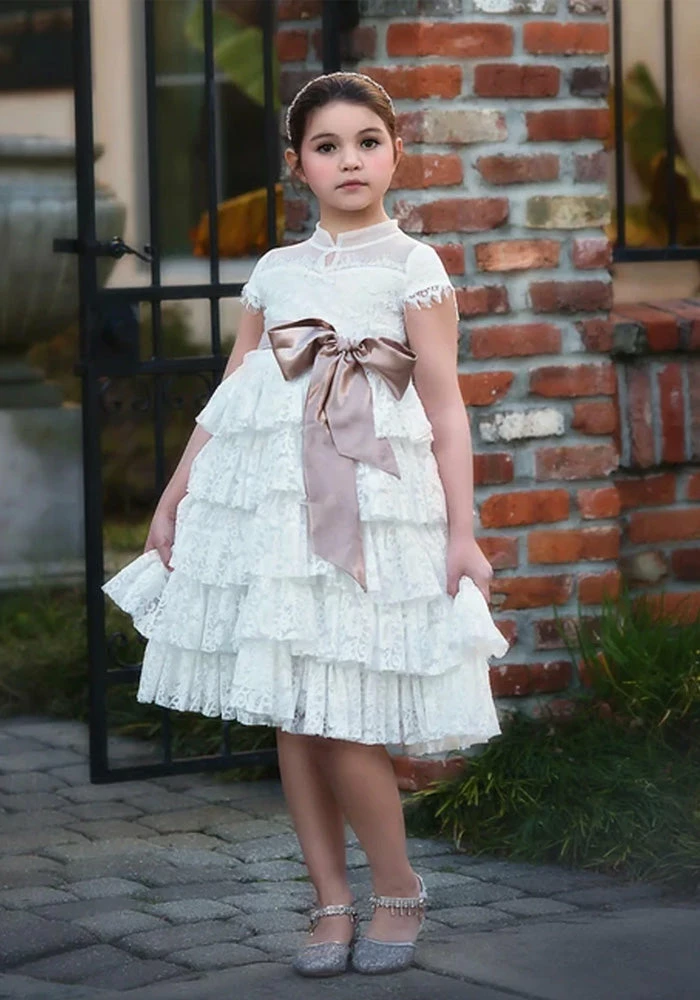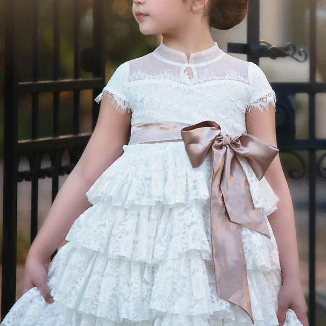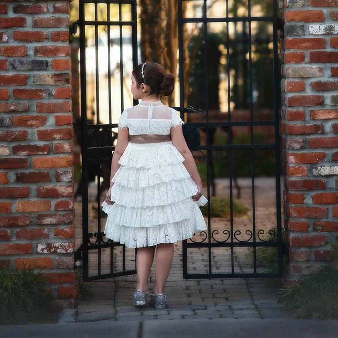 One of our most stunning gowns to date, this ruffled masterpiece will not disappoint! Our signature soft, French inspired lace, is perfectly layered and finished off with a removable sash. Two sash options come with the dress, tan as shown and solid white! Pair this with our sparkly shoes for the perfect head turning outfit. This gown is fully lined with soft cotton and back zips. Machine wash, hang dry.Â