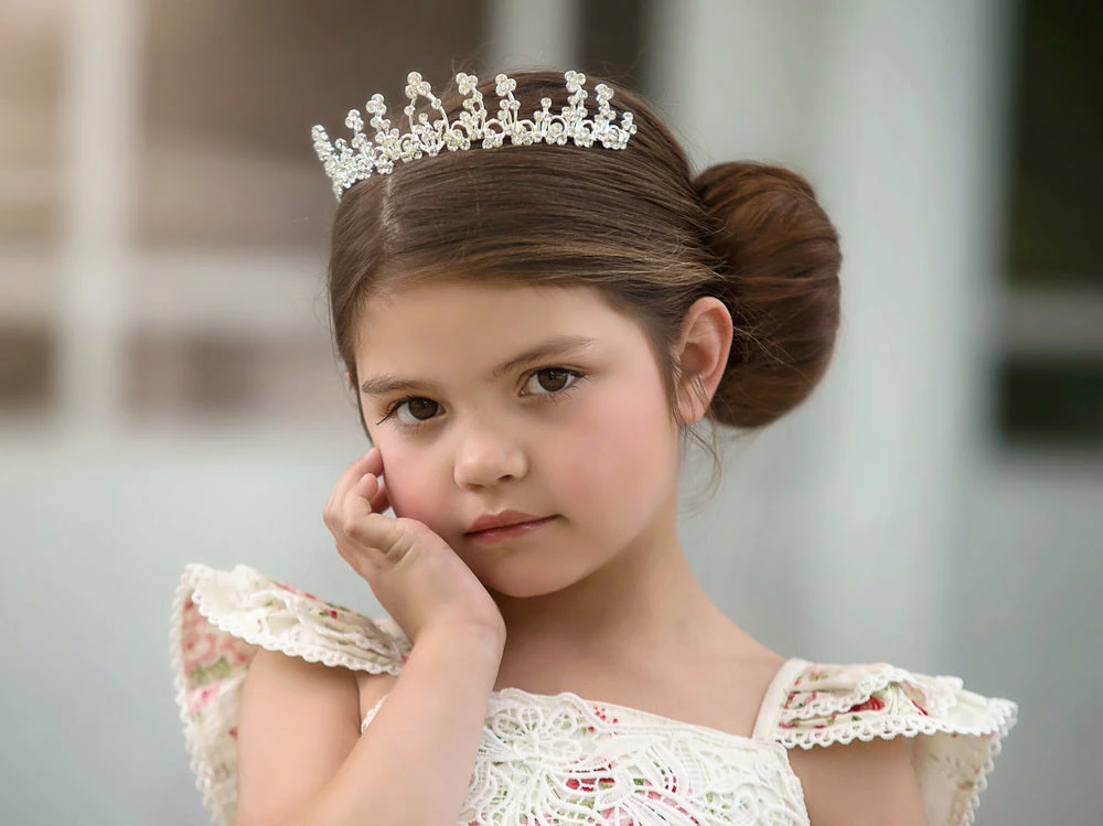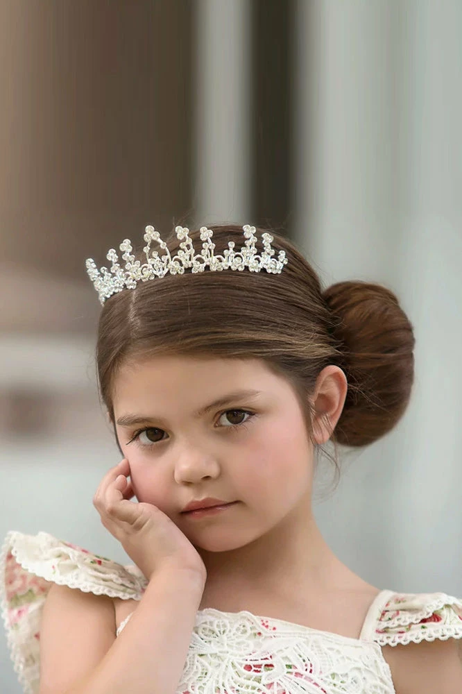 Whimsy meets sweetness in this oh so darling crown of whimsy. Rhinestones that sparkle make up this elegant metal crown, fit for a princess!