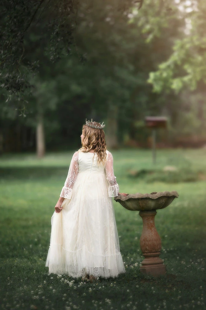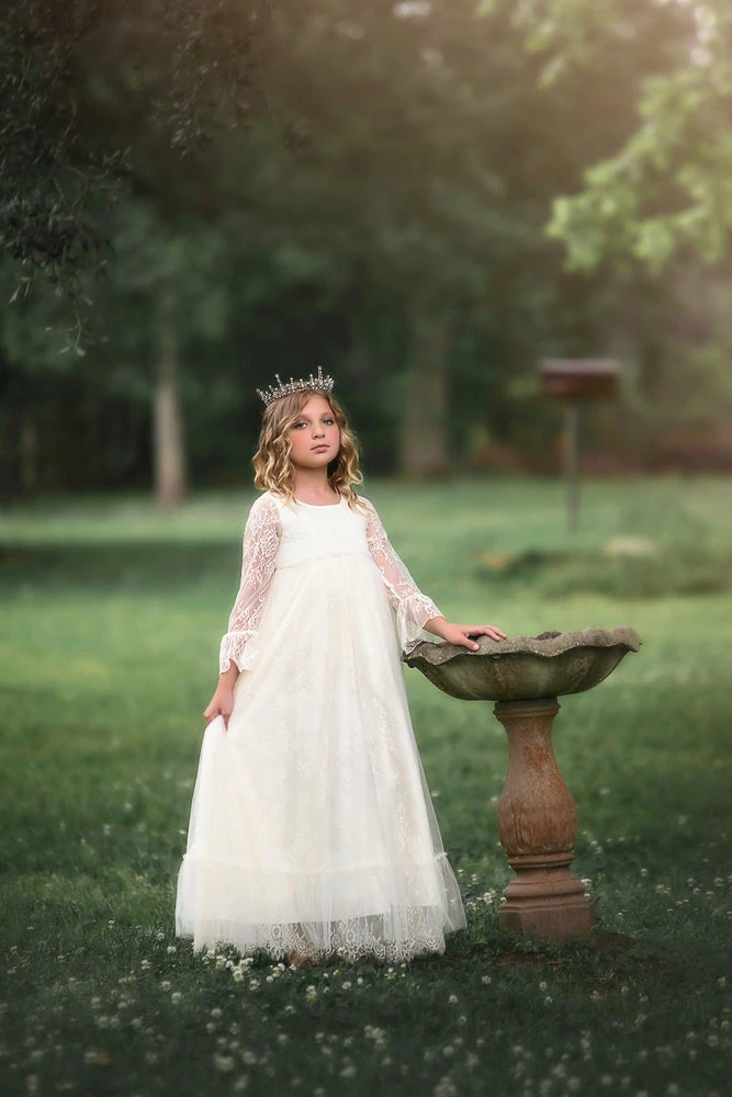 THIS DRESS RUNS ONE SIZE SMALL, WE ADVISE ORDERING UP ONE SIZE. This stunning vintage white lace gown will have all eyes on her! Our signature French inspired lace with eyelash trim is layered with tuling to create an oh so girly twirly frock! This gown is fully lined with soft cotton and our signature soft lace and fabrications are perfect for the most tactile sensitive child. She will never stop twirling! 100% poly self, 100% soft cotton lining. Machine wash, hang dry.Â