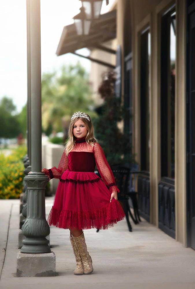 Introducing one of our newest Holiday dresses! The Maeve dress features a soft cotton yoke, a soft cotton velvet bodice, layers upon layers of tulle and finished with gorgeous cotton velvet and dotted lace trims. It truly is dotted perfection! Fully lined for optimal comfort, back zip. Machine wash, hang dry.Â