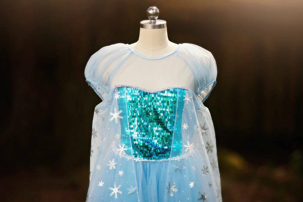The sheer embellished cape is attached to layers of tuling and a sparkly sequin bodice. Finished off with puff sleeves and sweet trim, this dress is a real gown and not a cheap plastic costume. We are never itchy and never use glitter. A tremendous value for such cuteness. 100% poly self, fully lined and back button. Hand wash, hang dry.  DO NOT WASH IN MACHINE, OR SNOWFLAKES WILL COME OFF.