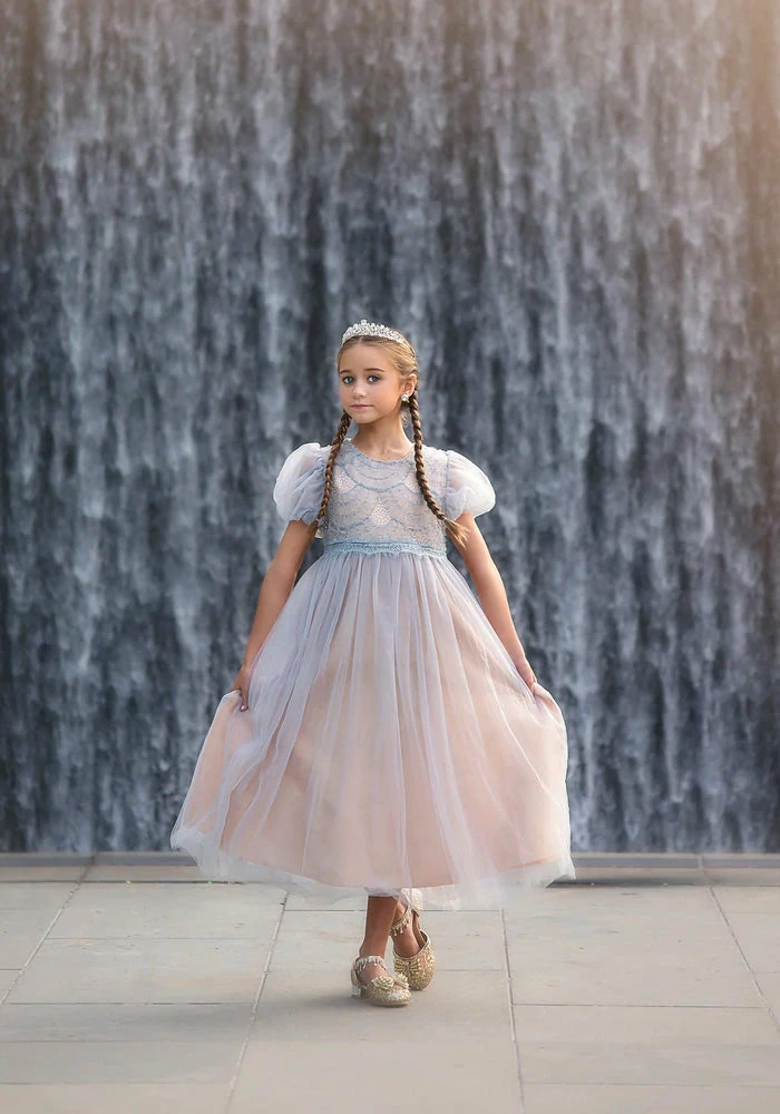 A little sparkle a little twirl, this gown has it all! Sequin and tulling scallops add just the right amount of sparkle to the bodice, a dainty poof finishes off the sleeve. The tulling skirt has a champagne lining for just the right touch of whimsy. This gown back zips and is fully lined with soft cotton. Machine wash, hang dry.