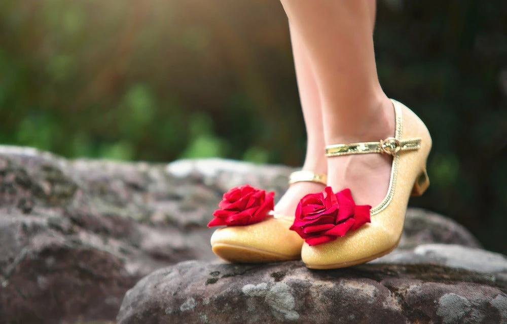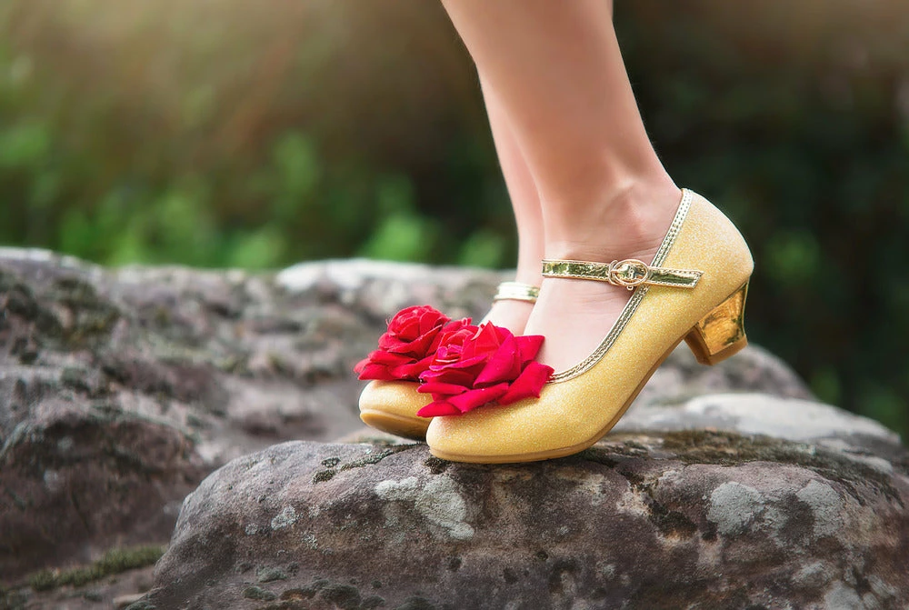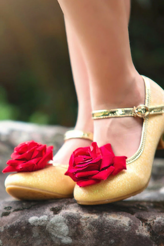 Let the imagination soar in these magical rose shoes! These yellow sparkly shoes are topped with a perfectly placed rose, for just the right touch of whimsy. Easy for little fingers to take on and off. Super comfy for tender feet, these shoes will have her twirling all day!