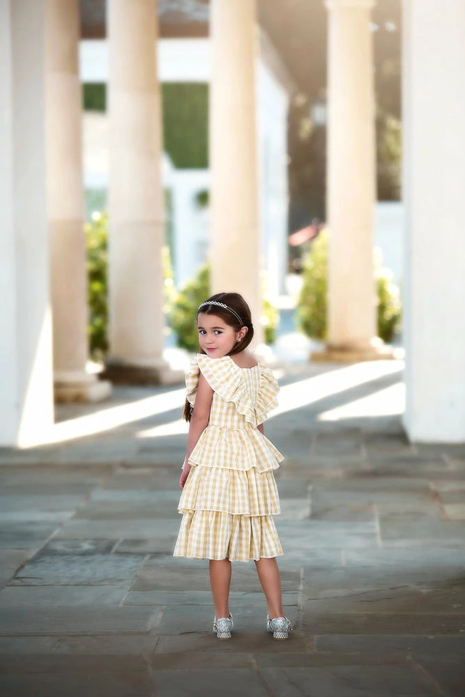 Our newest style, the Maizy dress is the perfect, lightweight twirly frock for Spring and Summer. Layers upon layers of ruffles grace the skirt, while the bodice is graced with diagonal ruffles for a feminine touch. Cotton/poly blend. Fully lined. Machine wash, hang dry.Â