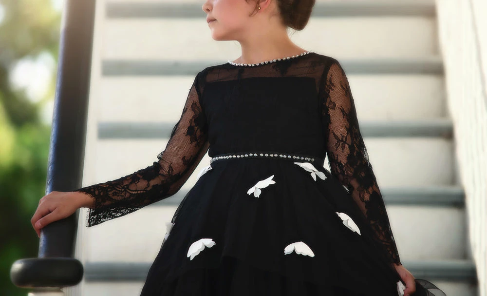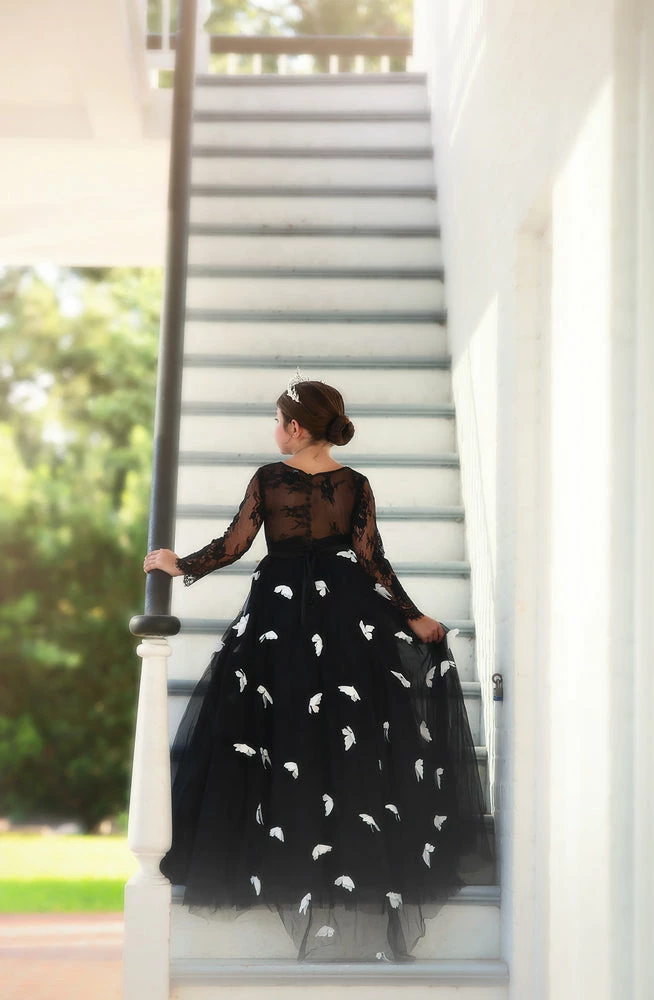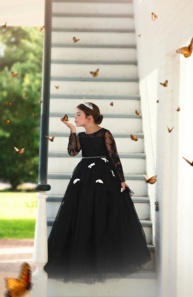 Introducing our most amazing gown to date! Â This butterfly gown is truly a work of art, with die cut butterflies trailing down the train of the dress. Â The soft lace bodice and sleeves, finished off with a hand beaded belt is fit for royalty. Â Covered satin buttons and a lace up back make for just the right fit. Â This gown will knock your socks off and you won’t believe you paid this little for a gown of this quality. Â A work of art for a magical photo shoot! Hand wash or dry clean. 100% soft poly, not scratchy for the little ones.