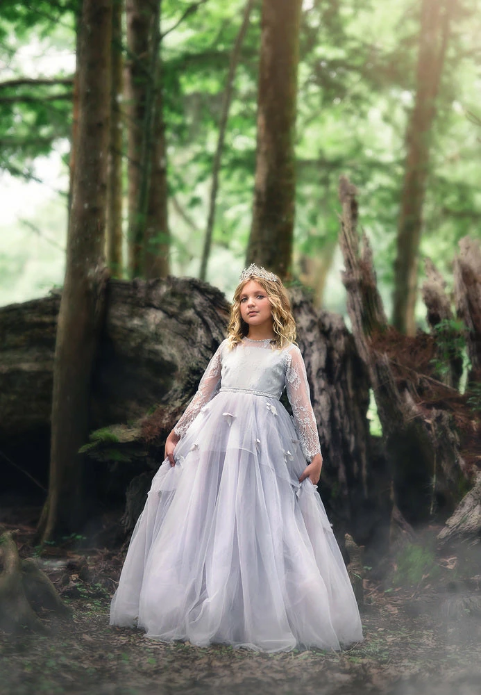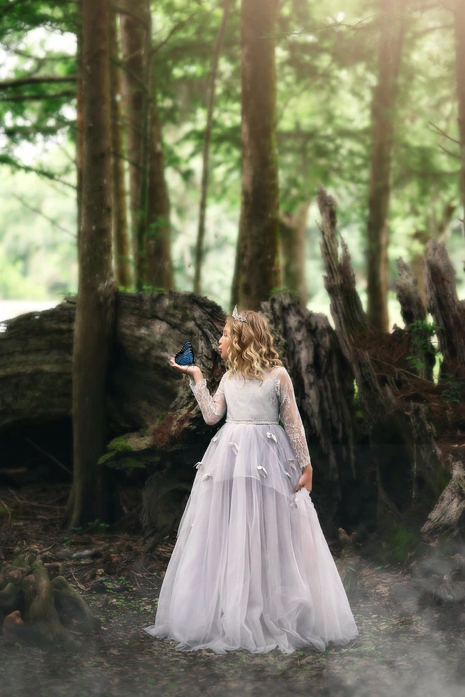 Introducing our most amazing gown to date! Â This butterfly gown is truly a work of art, with die cut butterflies trailing down the train of the dress. Â The soft lace bodice and sleeves, finished off with a hand beaded belt is fit for royalty. Â Covered satin buttons and a lace up back make for just the right fit. Â This gown will knock your socks off and you won’t believe you paid this little for a gown of this quality. Â A work of art for a magical photo shoot! Hand wash or dry clean. 100% soft poly, not scratchy for the little ones.
