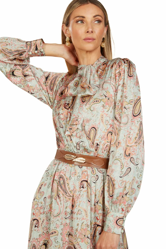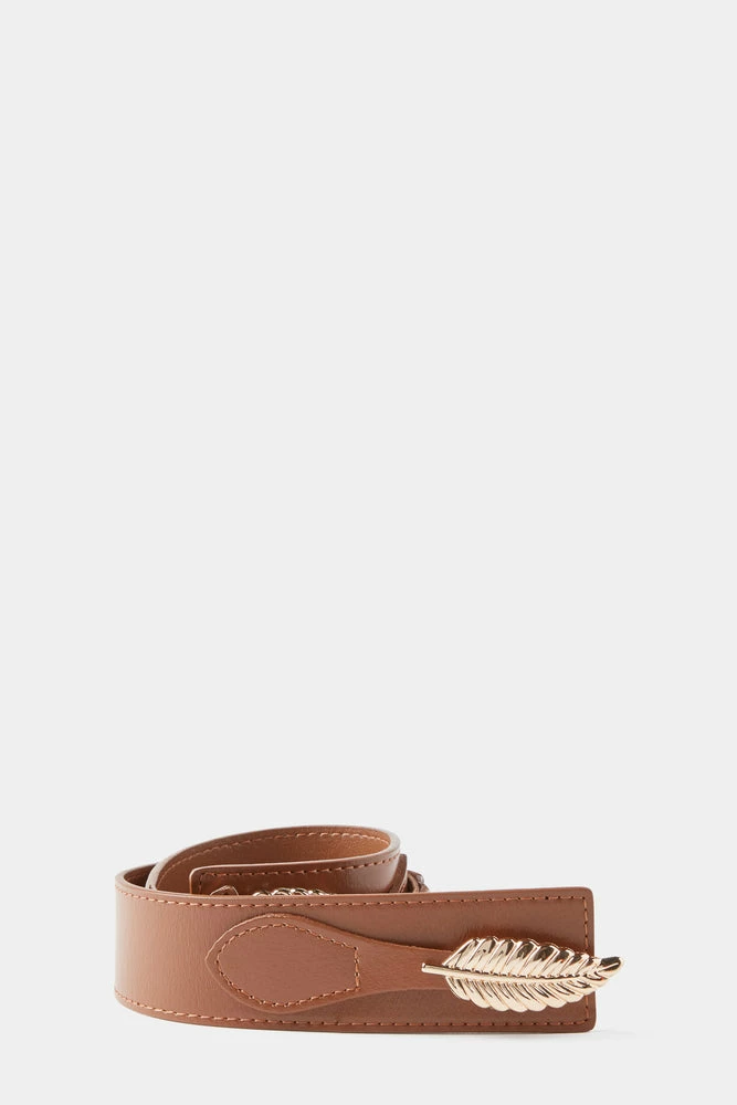 Adorned with a gold feather closure, this leather belt is a perfect companion to our dresses or a casual pair of denim.