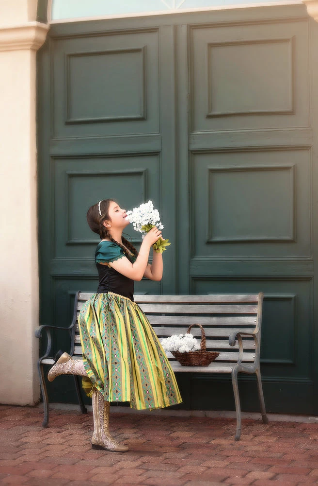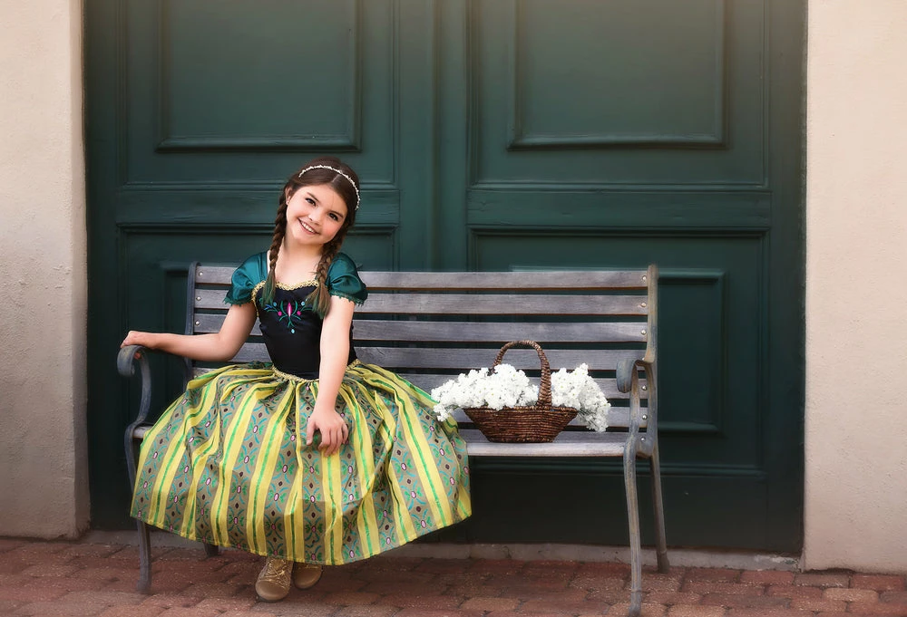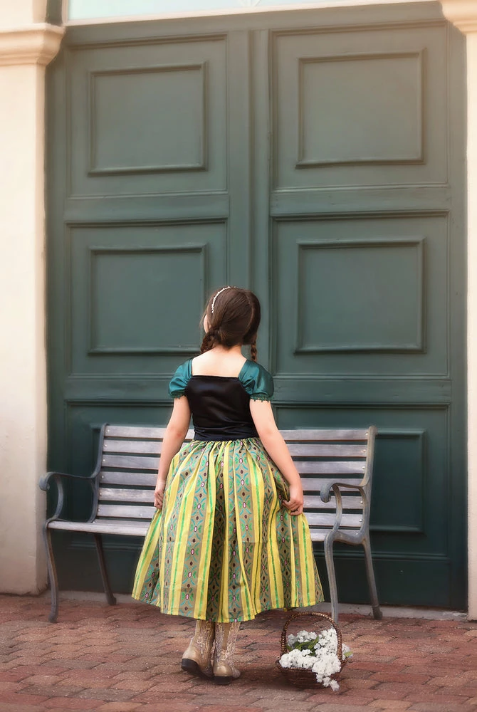 The princess has arrived and she will have all eyes on her! The tapestry inspired skirt has all the twirl a girl could ask for. The sweetheart neckline bodice is embroidered with a swirly flower detail and finished off with regal gold trimmings. The soft satin emerald sleeves, cover her sweet shoulders with grace and style. This dress is gorgeous and she will never want to take it off! This dress is fully lined with soft cotton and side zips. Machine washable, hang dry. Â