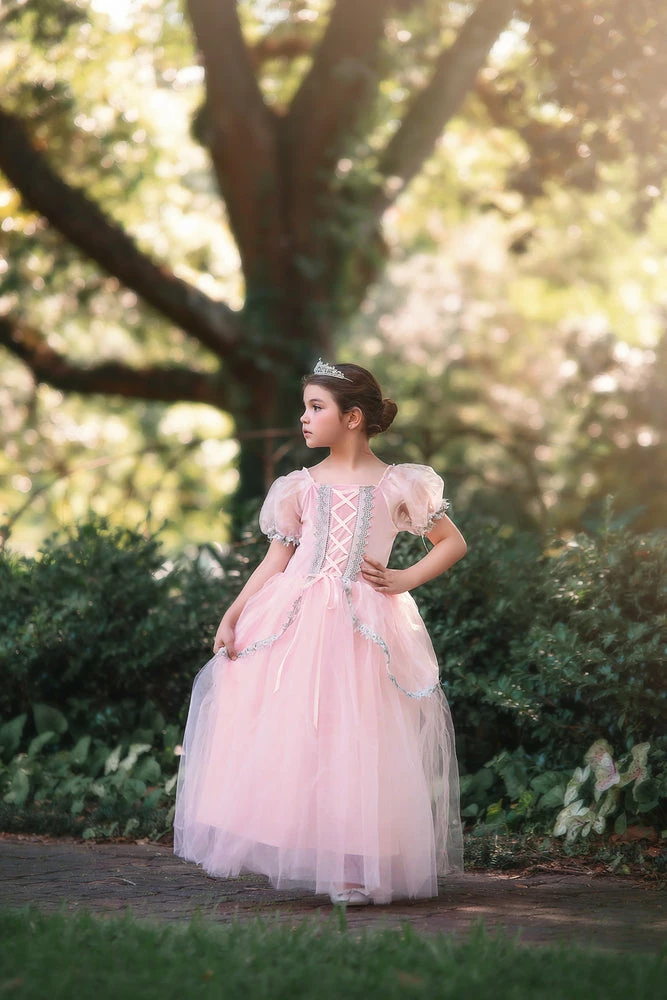 All the poof, all the twirl, your girl will be all smiles in this perfect princess dress! Soft tuling and velvet, graced with silver trimmings, this gown is perfect for the most regal of princesses! Like all of our dress up, this gown is fully lined with soft cotton, never itchy and perfectly playful! Elastic back. Machine wash, hang dry.Â