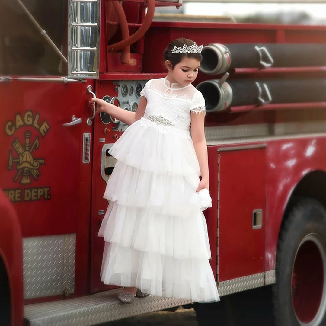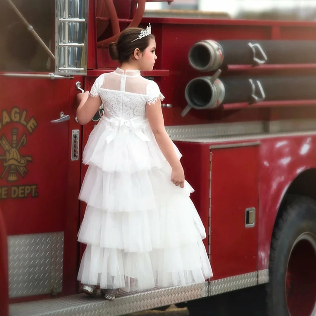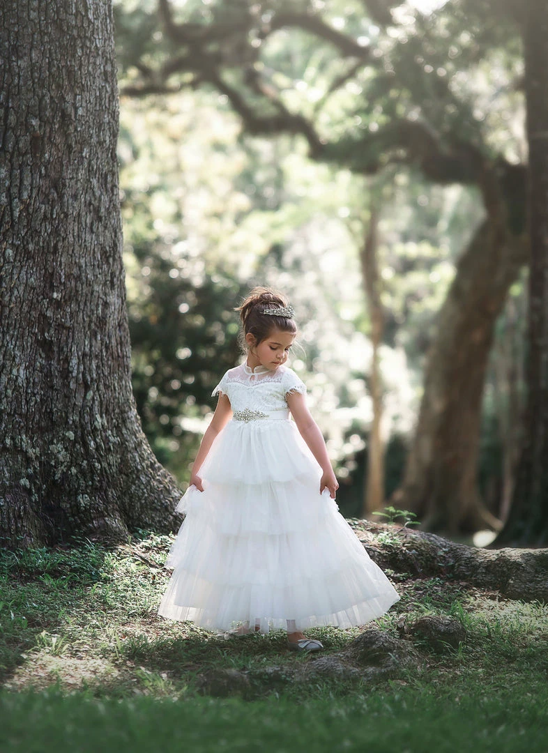This dress is amazing. It has ruffles, it has lace, it has sparkle and drama! The french lace bodice covers a sweetheart neckline with our signature soft fabrications, never scratchy. The skirt is comprised of layer and layers of bouncy and twirly tulling that extend down to the ground. The removable sparkle belt self ties in back for just the right fit. This is a showstopper gown and will be a favorite for generations to come. 100% poly self, 100% soft cotton lining. Machine wash, hang dry. Fully lined, back zip.Â