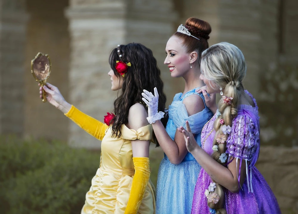 Our most popular dress-up gown for girls is now here for women! Row upon row of luxe ruched satin, the skirt of this gown is every little girls dream! The bodice, graced with gold lace and sequin detailing, is finished off with a perfectly placed red rose. The velvet sleeves add the finishing touch to this amazing gown. You will never want to stop twirling! Satin shoulder straps are in place for just the right fit. Gloves are completely detached from gown and can be worn separately. 100% poly self, 100% cotton lining. Hand wash, hang dry. Â