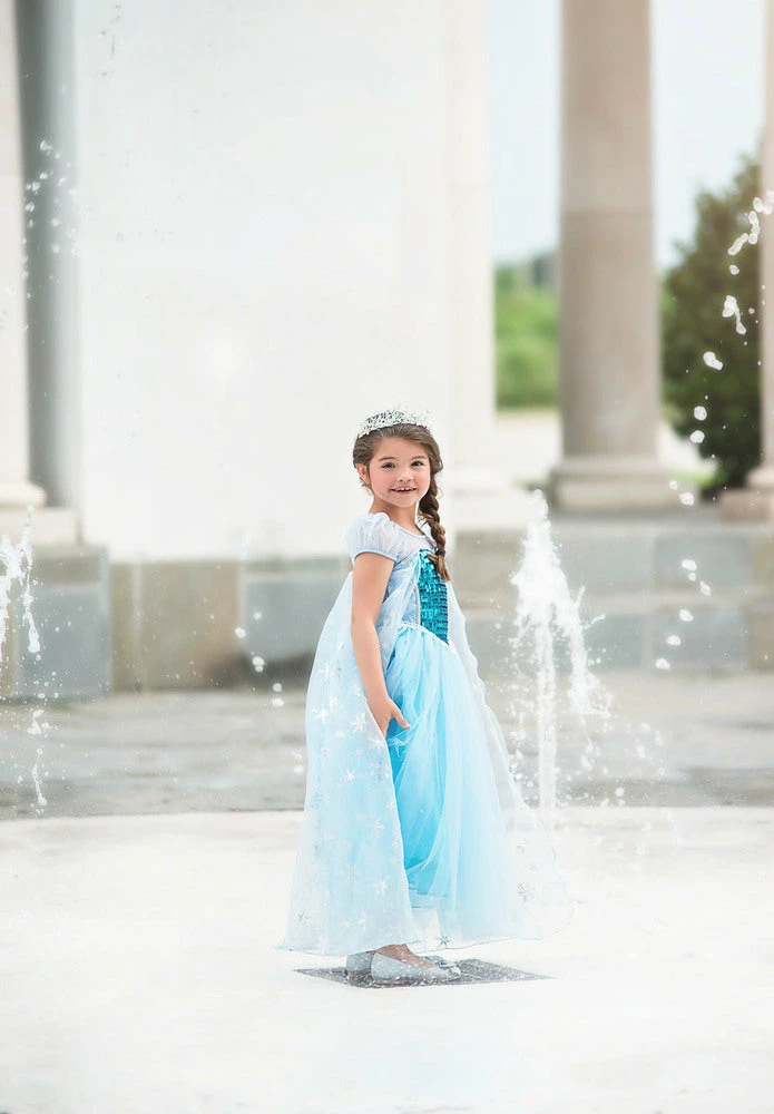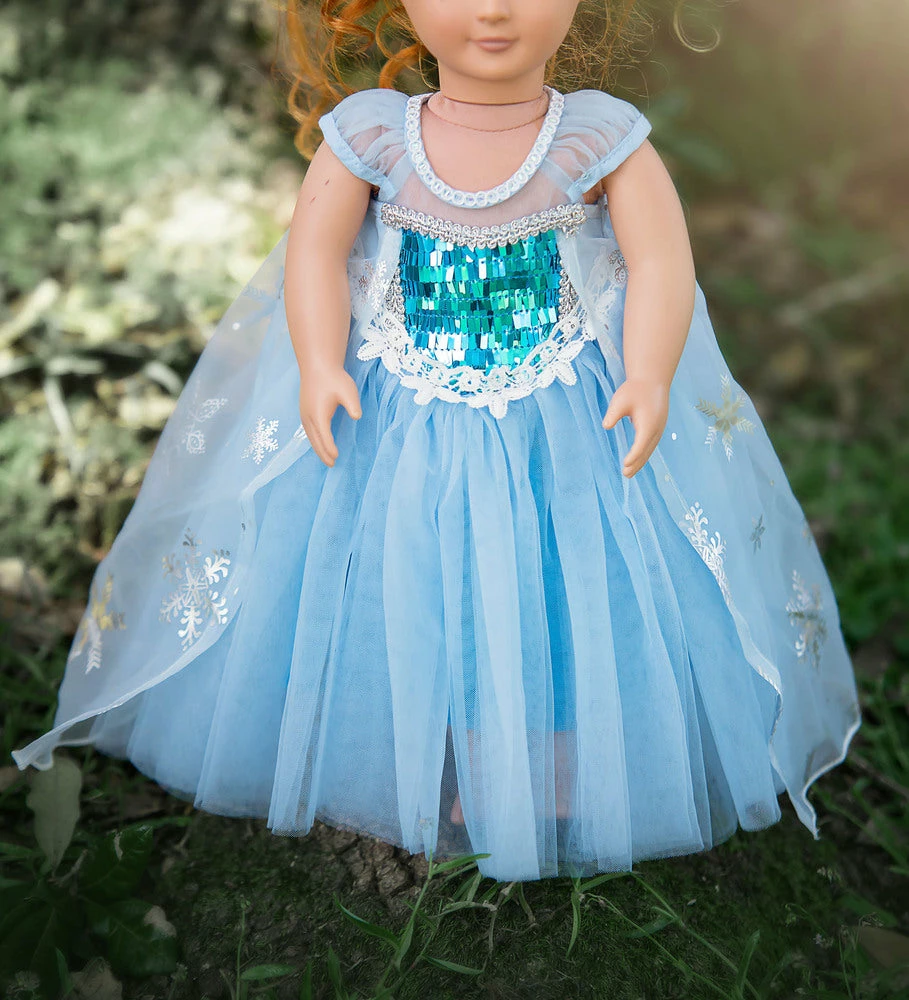 One of our most adorable costumes, this dress will not disappoint with all it’s cuteness! The sheer embellished cape is attached to layers of tuling and a sparkly sequin bodice. Finished off with puff sleeves and sweet trim, this dress is a real gown and not a cheap plastic costume. We are never itchy and never use glitter! A tremendous value for such cuteness. 100% poly self, fully lined and back button. Hand wash, hang dry.  DO NOT WASH IN MACHINE, OR SNOWFLAKES WILL COME OFF. DON’T FORGET HER MATCHING DOLL DRESS!