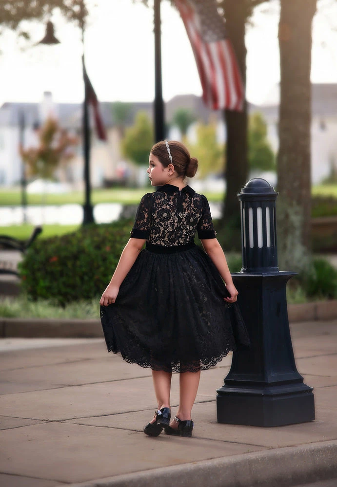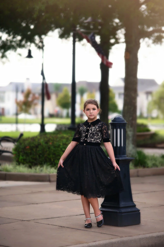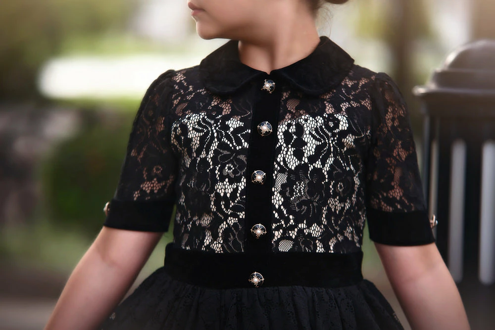 Elegant, vintage and glam! The entire dress features stunning, soft cotton lace with a scalloped hem and with a tan cotton lining for optimal comfort & an extra hint of richness. The bodice, collar and sleeves feature soft velvet trim and are adorned with vintage-inspired buttons. She will never want to take this off! Zip in back. Hand wash, line dry.