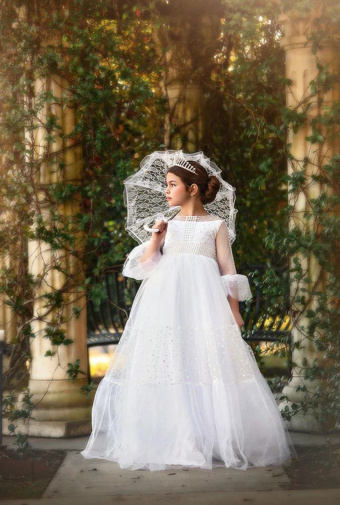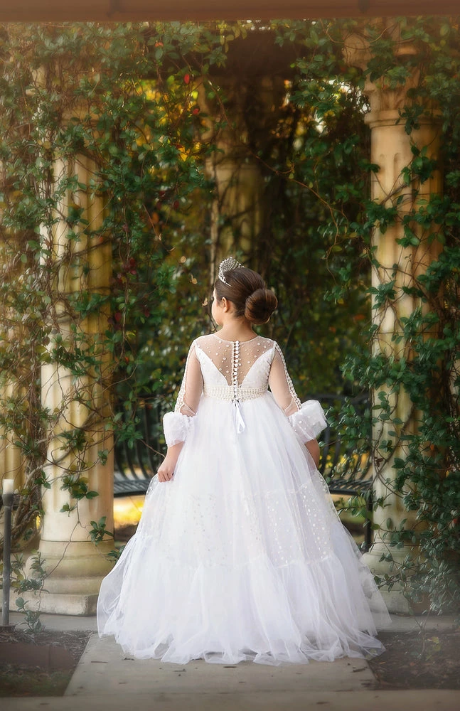 One of our most luxury gowns to date, this regal gown will have all eyes on her! The soft dotted mesh bodice is graced with a perfect dainty lace, while the poof filled skirt has all the twirl a girl could ask for. The back of this gown is an absolute show stopper, with feminine button detailing and a lace up back for just the right fit. If you’re looking for a luxury WOW factor gown for the most discerning of events, this choice will not disappoint. As with all of our clothing, this gown is made with the softest of materials, fully lined and never itchy.Â