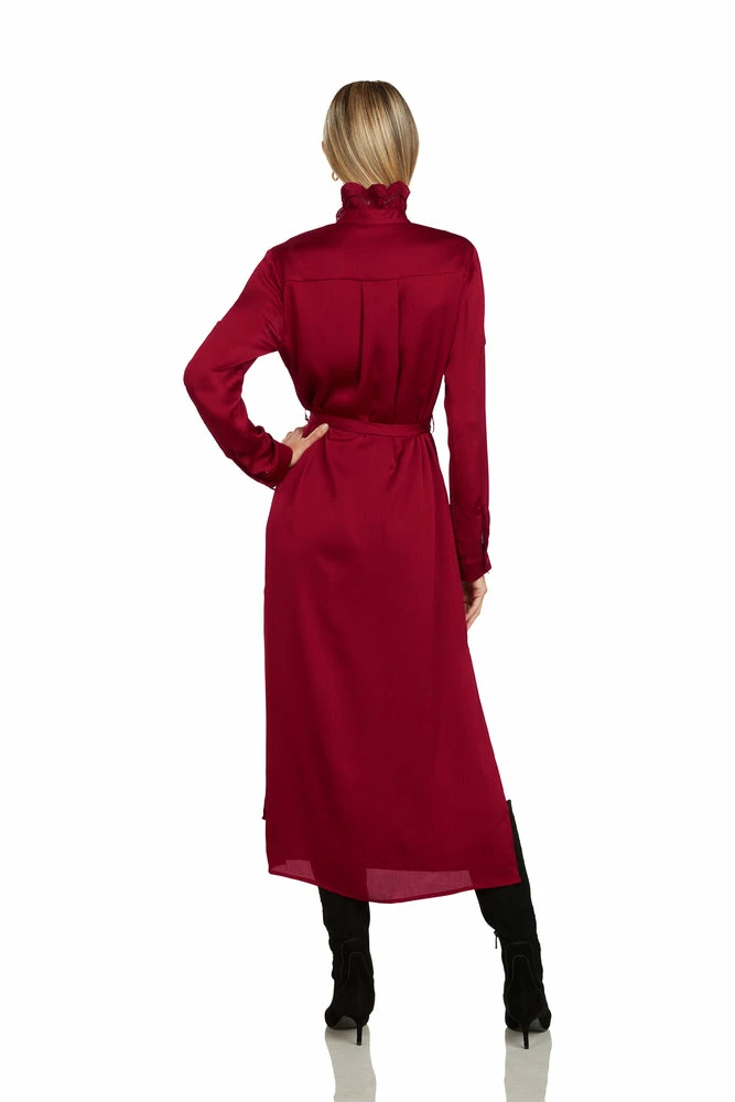 This dress has side slits and a self tie waist. This look is perfect for the office or a fun night out.Â
