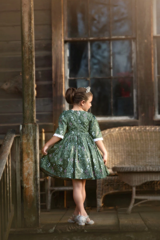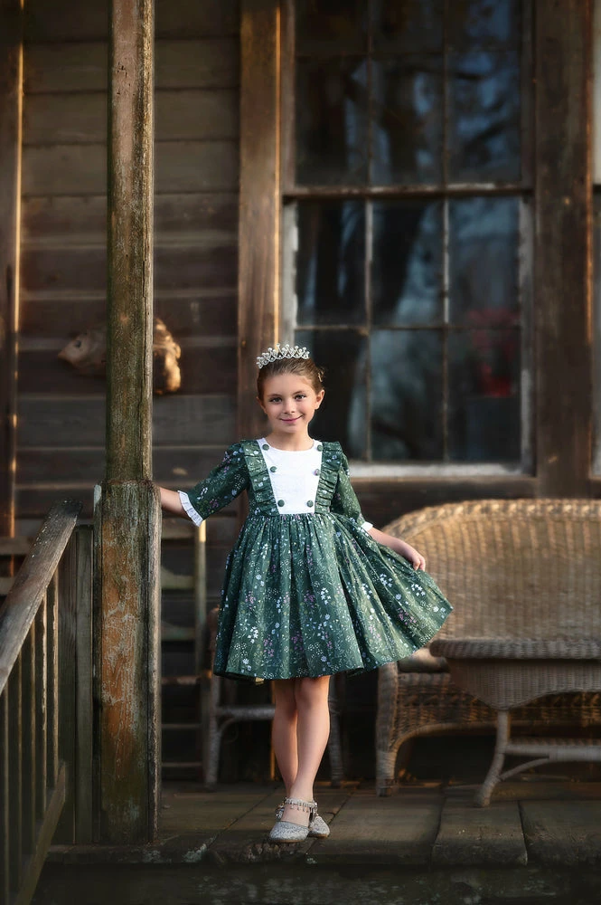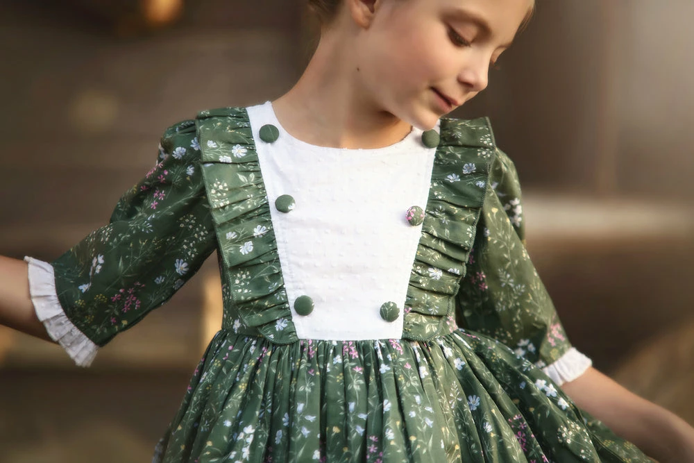 Our top-selling Lola dress has been reinvented with a touch of Spring! She will be the talk of all your gatherings this season! The bodice is detailed with a white Swiss dot and delicate diagonal ruffles, and is finished off with sweet floral buttons. Half-sleeves with a ruffle trim make an easy, breezy Spring/Summer look. Truly a keepsake to be passed down from generation to generation. 100% soft brushed cotton, fully lined with soft cotton and back zips. Machine wash, hang dry.Â