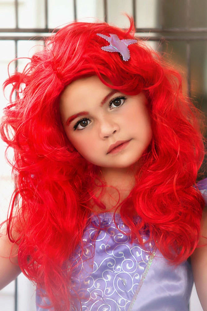 Cute as can be! She will have so much fun playing dress up in our luxe red wig. This wig pairs perfectly with our mermaid costume and comes with a perfectly placed starfish atop her fiery crown. Like all of our dress up items, these are high quality heirloom pieces. Your princess will never want to take it off! 100% poly. Â