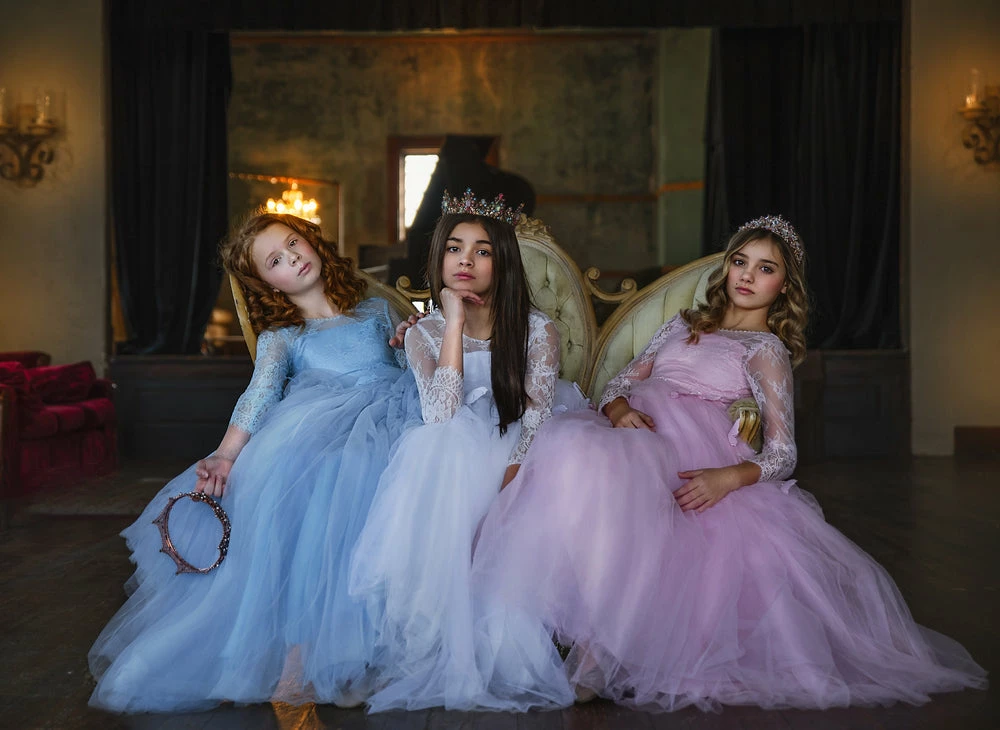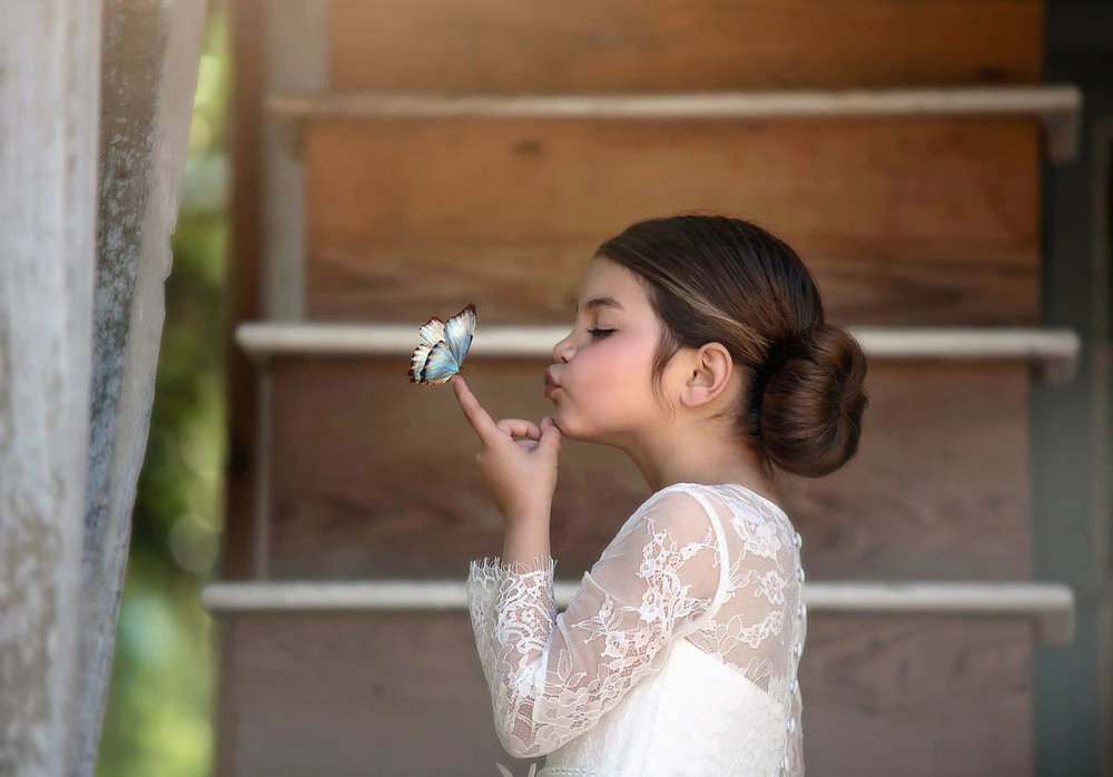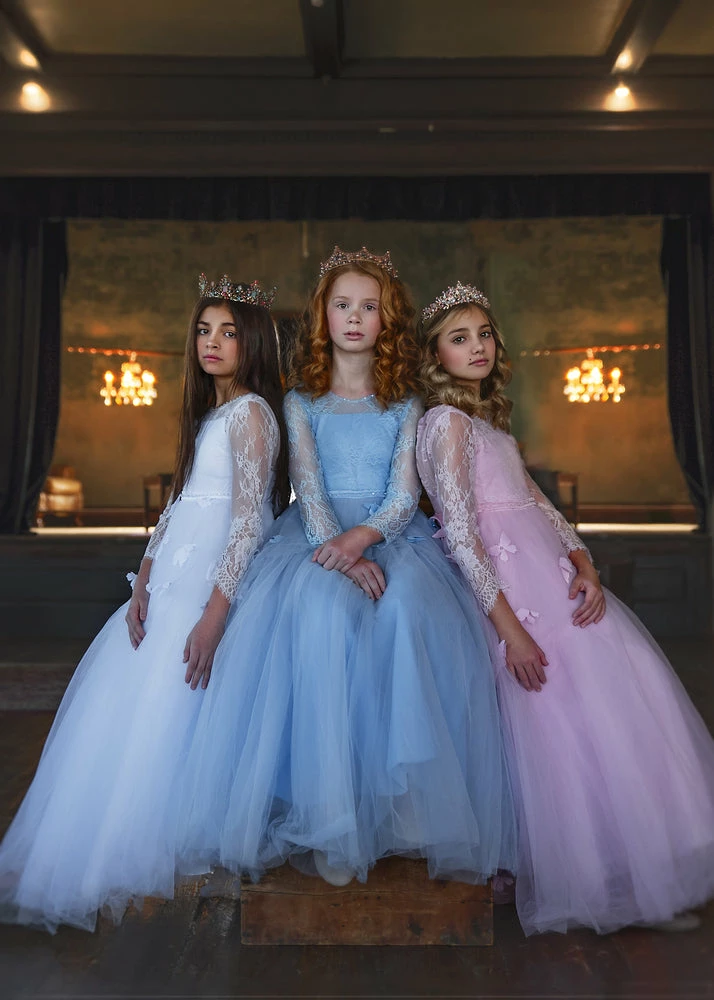 Introducing our most amazing gown to date! Â This butterfly gown is truly a work of art, with die cut butterflies trailing down the train of the dress. Â The soft lace bodice and sleeves, finished off with a hand beaded belt is fit for royalty. Â Covered satin buttons and a lace up back make for just the right fit. Â This gown will knock your socks off and you won’t believe you paid this little for a gown of this quality. Â A work of art for a magical photo shoot! Hand wash or dry clean. Â 100% soft poly, not scratchy for the little ones.Â