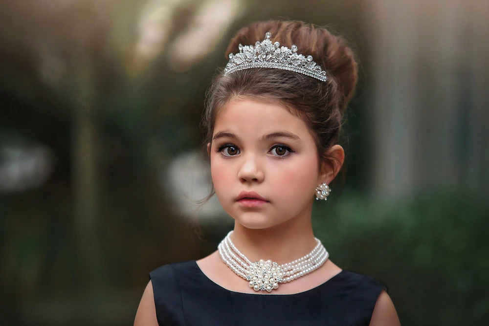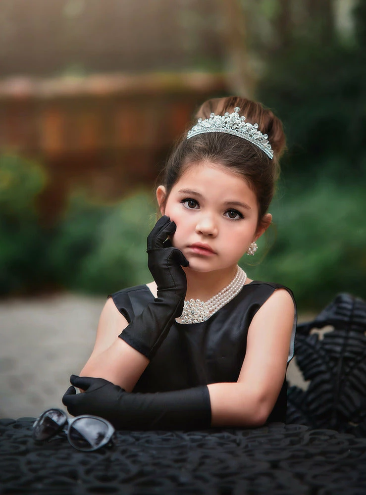 She will be ready for breakfast, dinner or the theatre wearing this super chic outfit! There’s nothing left out, everything you need is included: The little black dress, the black gloves, the tiara, the necklace & earrings set, the chic black sunglasses and the shopping bag! The dress is awesome quality and comes with a sweet V back and self ties for just the right fit. The little black dress is fully lined with the same blue cotton as her shopping bag. Our jeweled shoes are sold separately. This set is to die for! DON’T FORGET HER MATCHING DOLL DRESS!