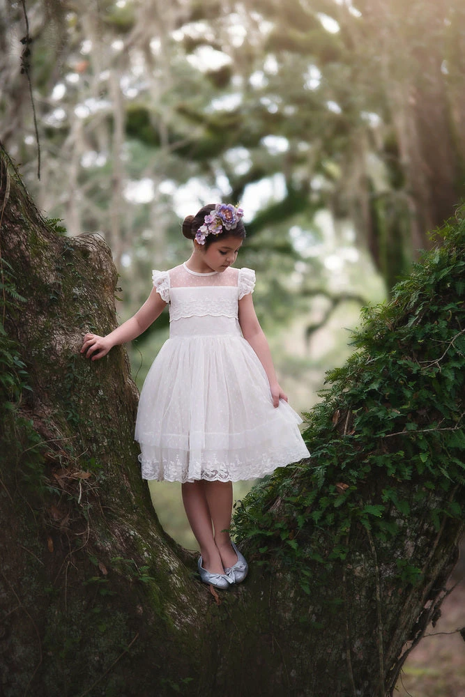 All of the bounce and all of the twirl, this sweet dot mesh dress has it all! Scalloped lace and a dainty ruffled sleeve make up the bodice, while layers and layers of etherial dots grace the lace trimmed skirt. A showstopper of a dress that she will never want to take off! Our signature soft lace is fully lined with soft cotton, perfect for the tactile sensitive child. Back zip. Machine wash, hang dry.Â