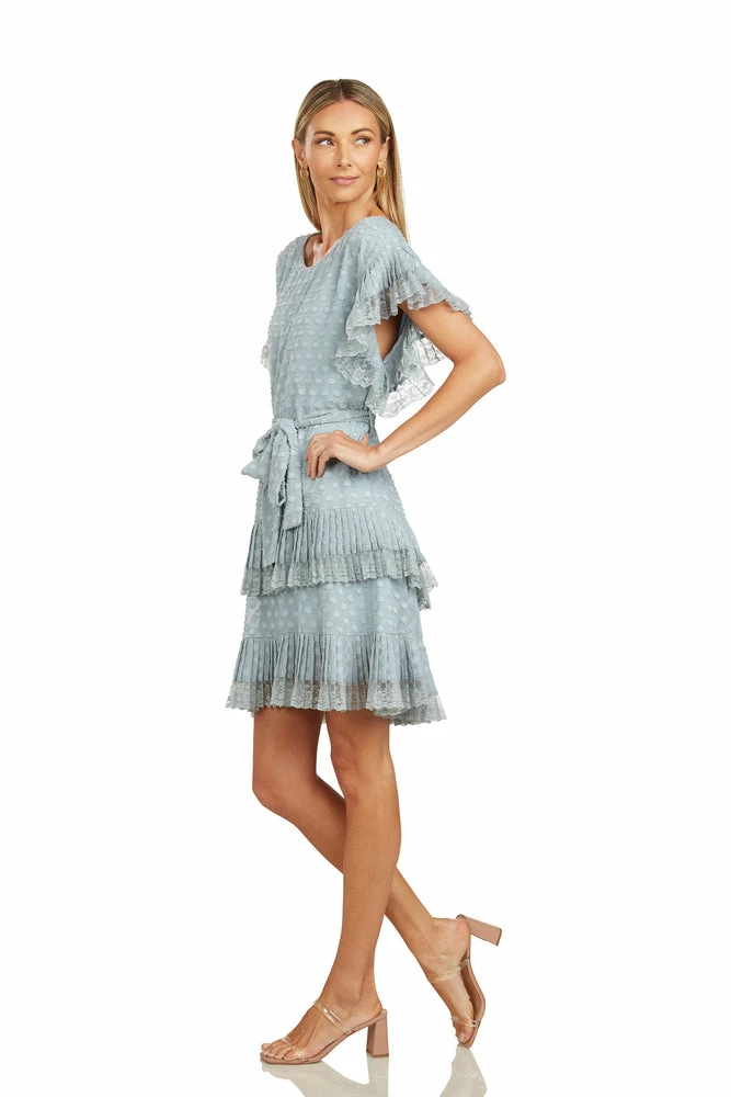 This dusty blue dot chiffon dress has feminine ruffles graced with lace,