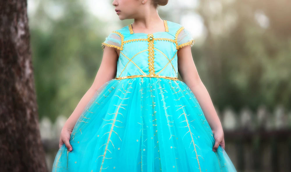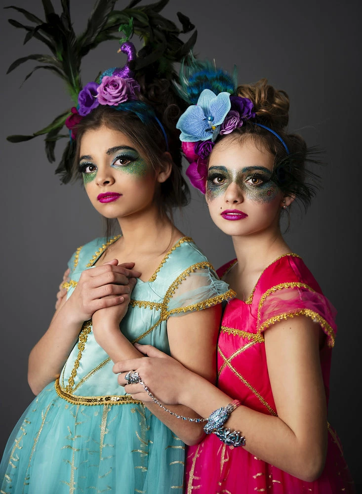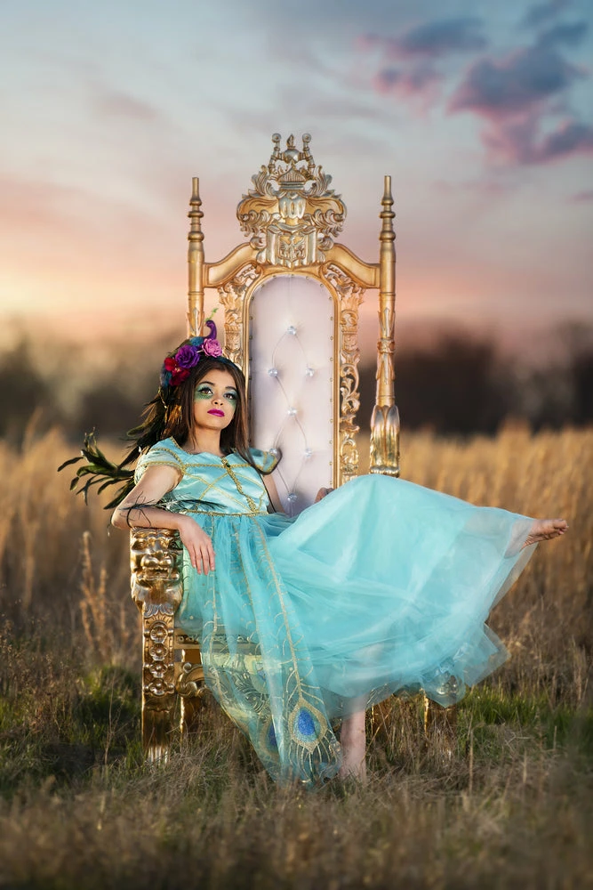 She will have all eyes on her wearing this peacock gown! This gown is stunning with it’s contrast gold trimmings and peacock printed tulling, she will want to twirl all day! Fully lined with soft cotton and never scratchy. Perfect for the tactile sensitive child. Back zip, machine wash, hang dry.Â