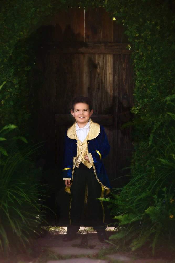 This luxe costume will have all eyes on HIM! This 4 pc. set includes the velvet jacket, the vest, pant and shirt.  The velvet jacket in all of it’s splendor and trimmings, has formal tails and perfectly lined with gold jacquard fabric. The jacquard vest has an adjustable back and finished off with gold buttons. The striped tuxedo pant has an elastic waist for just the right fit. The button front shirt is finished off with dapper lace cuffs, reminiscent of 18th century royalty. Truly an amazing keepsake that will not disappoint. 100% poly, machine wash, hang dry.