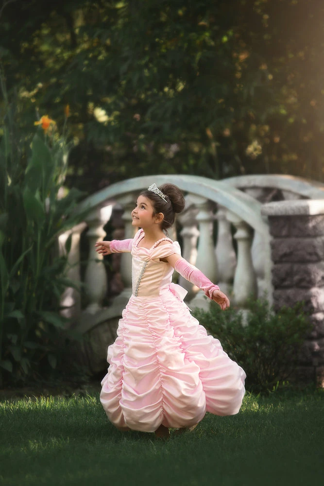 Part of our luxe collection, this gown & gloves set, will have all eyes on her. Row upon row of luxe ruched satin, the skirt of this gown is every little girls dream! The bodice, graced with lace and sequin detailing has just the right amount of whimsy and sparkle. The velvet sleeves add the finishing touch to this amazing gown. She will never want to stop twirling! Satin shoulder straps are in place for just the right fit. The velvet gloves are completely detached from gown and can be worn separately. 100% poly self, 100% cotton lining. Machine wash, hang dry. DON’T FORGET HER MATCHING DOLL DRESS!Â
