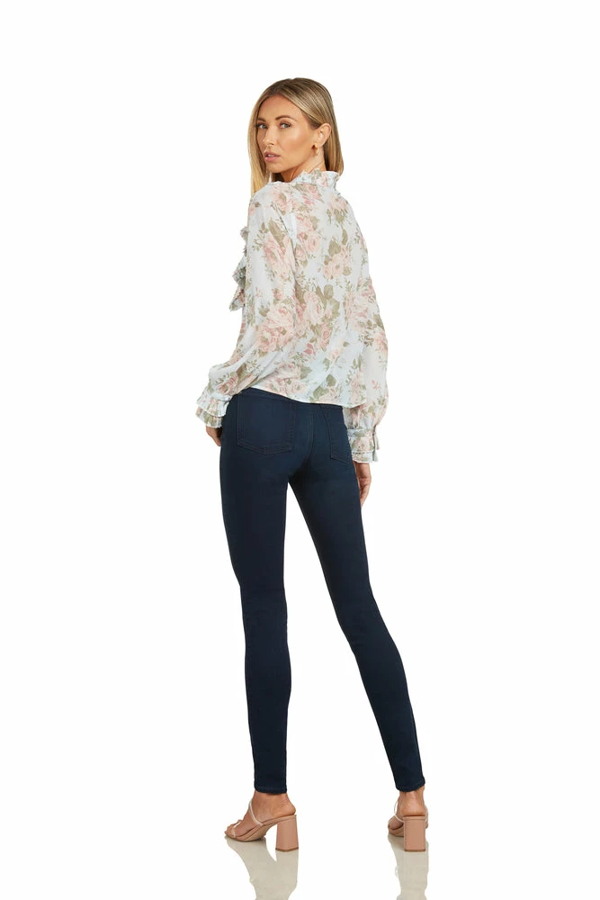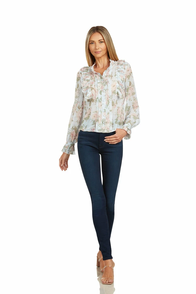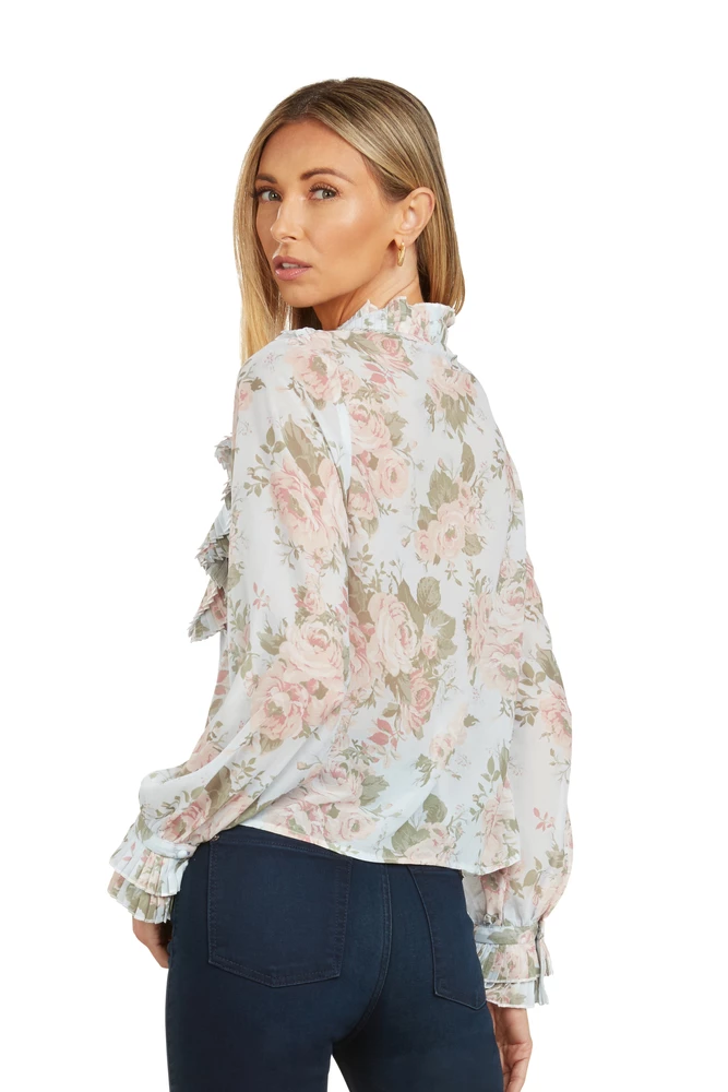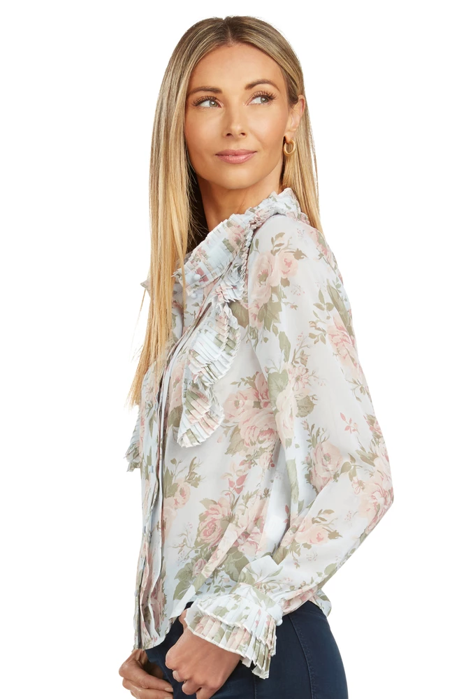 This floral chiffon ruffled blouse is truly stunning.Â