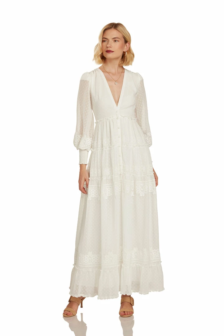 A jaw-dropping choice for Spring, this one is stunning from all angles. A delicate dot fabric meets sweet embroidery and trims, subtle ruffles, and finished with a cuffed puff sleeve. A dramatic and feminine deep-v neck completes the look! A perfect choice for beach, dinner, party, photoshoot… you name it. It’s that versatile. Gorgeous coming and going!